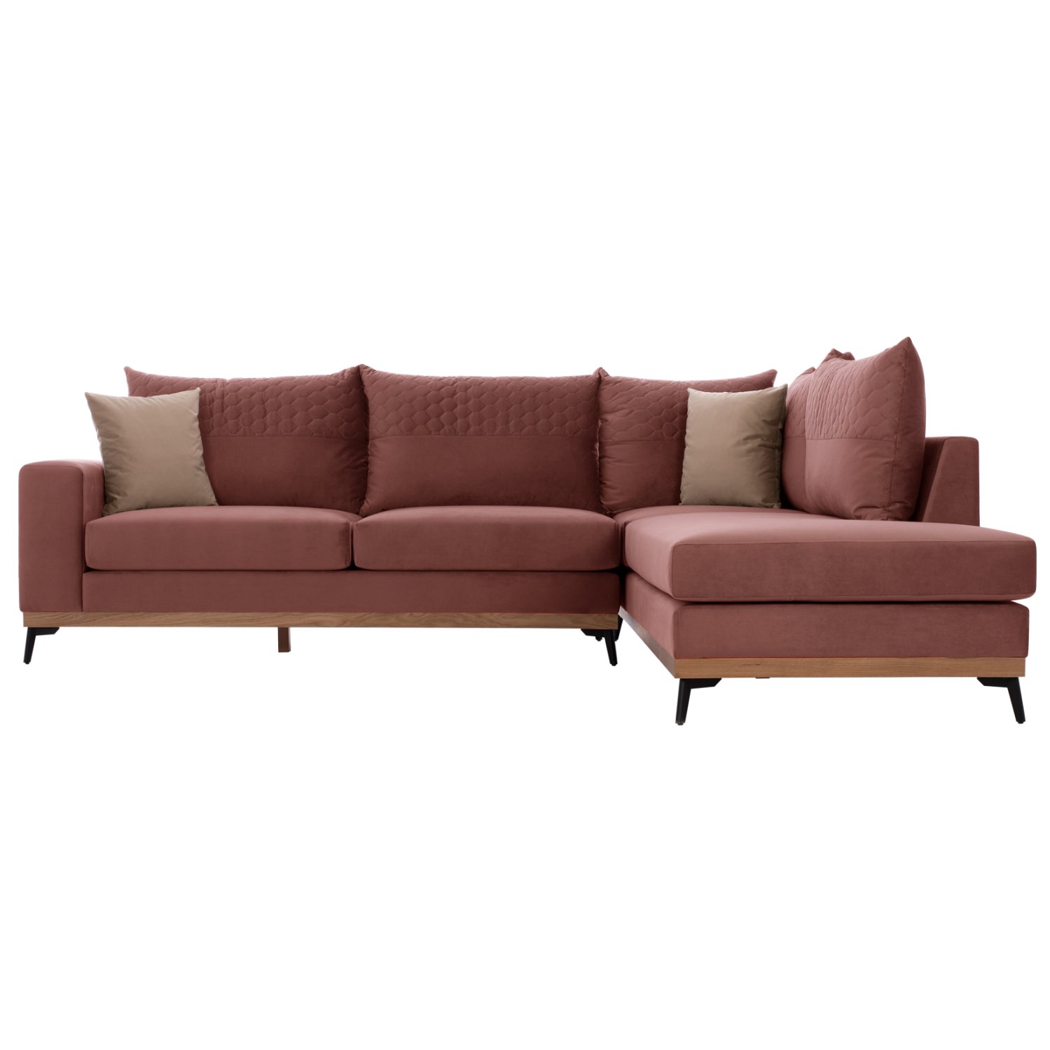 Ξεκινώντας από τα βασικά και τα προφανή, το χρώμα της βελούδινης επένδυσης του μεγάλου αυτού καναπέ είναι SAHARA 08- σάπιο μήλο. Διαθέτει 5 μαξιλάρια πλάτης στο ίδιο χρώμα και δύο μικρότερα διακοσμητικά μαξιλάρια σε SAHARA 03- εκρού χρώμα. Τα 4 μαξιλάρια καθίσματος σε συνδυασμό με αυτά της πλάτης, δίνουν την τέλεια αίσθηση άνεσης! Τα μαξιλάρια πλάτης έχουν τεχνοτροπία καπιτονέ κατά το ήμισυ, όπως υπάρχει και μια πανέμορφη καπιτονέ λωρίδα στο μεγάλο μπράτσο. Το μεγάλο μαξιλάρι καθίσματος που σχηματίζει την γωνία δεν θα δυσκολέψει τον χρήστη φεύγοντας από την θέση του, επειδή διαθέτει «χρατς» και κολλάει στην ειδική επιφάνεια του σκελετού. Το κομμάτι που δημιουργεί την δεξιά γωνία, είναι κουμπωτό και συνδέεται με τον υπόλοιπο καναπέ αρμονικά με ενισχυμένους γαλβανιζέ αναρτήρες πάνελ (κατακόρυφα συρταρωτά) για τεράστια αντοχή και ευκολία στην χρήση.