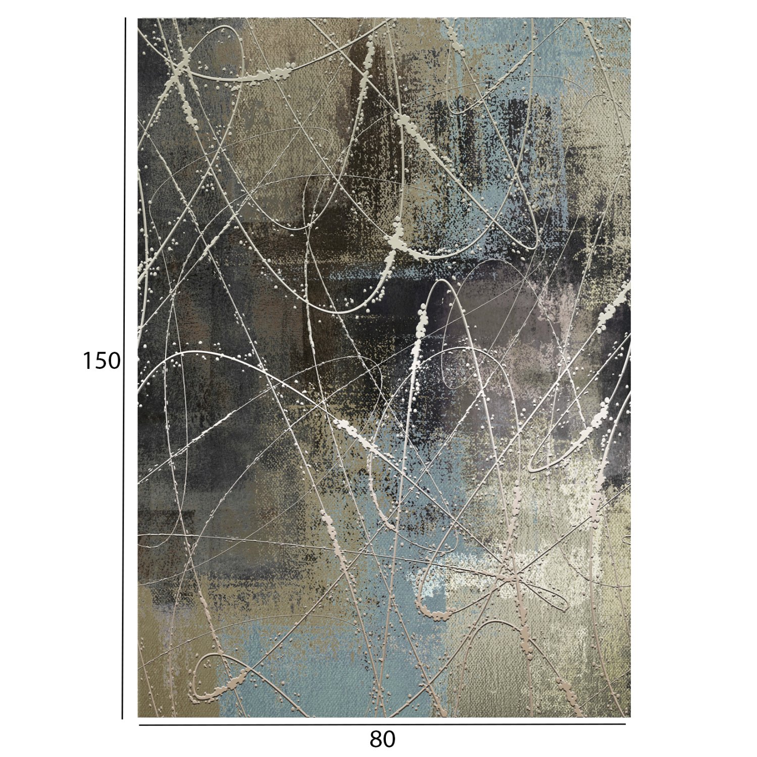 Αυτό το μοντέρνο χαλί έχει κυρίαρχα χρώματα το μπεζ, το γκρι σε πολλές αποχρώσεις του, και το πολύ ξεθωριασμένο γαλάζιο. Το έντονο χαρακτηριστικό του είναι οι τυχαίες λευκές γραμμές και καμπύλες με τις επίσης λευκές τελείες κατά μήκος των γραμμών που δίνουν μια τρισδιάστατη αίσθηση. Ένα μοντέρνο χαλί που θα τραβήξει τα βλέμματα και θα αναβαθμίσει αισθητικά το σαλόνι σας.