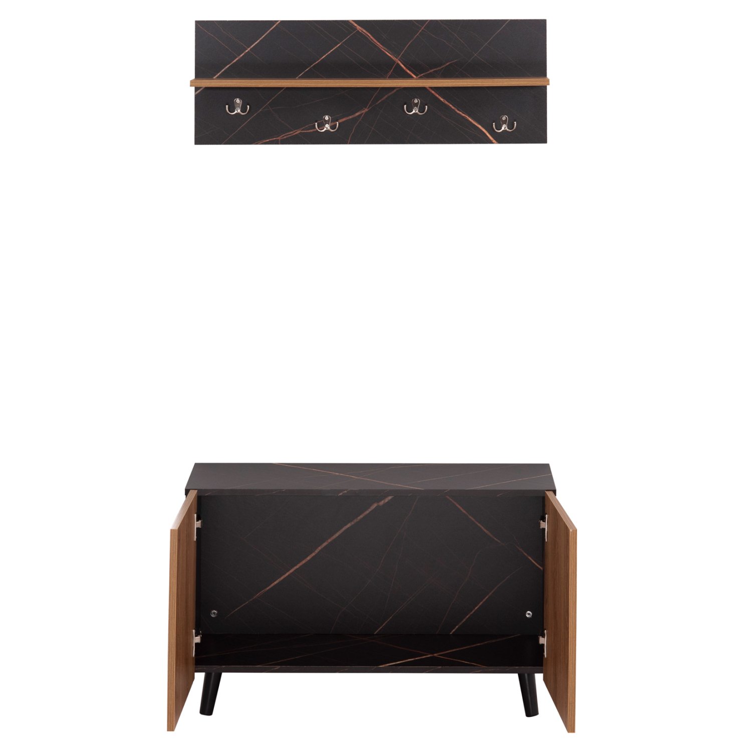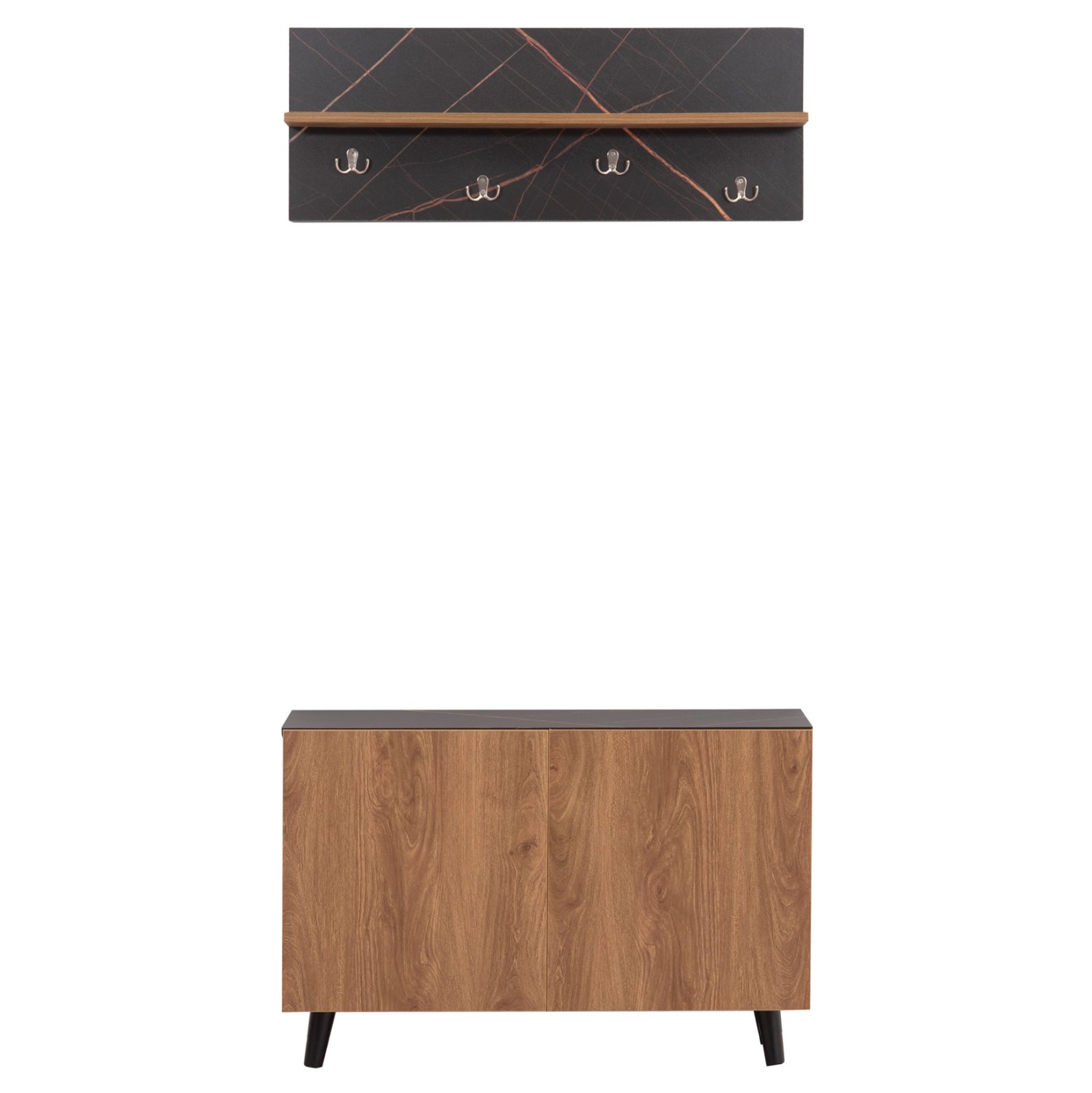 Το σετ εισόδου DELPHINE αποτελείται από μια παπουτσοθήκη-ντουλάπι με ψηλά πόδια με δύο πόρτες και ενιαίο χώρο αποθήκευσης και μια κρεμάστρα τοίχου με ράφι. Η κρεμάστρα διαθέτει 4 διπλά σημεία κρέμασης ενώ το ράφι προσδίδει επιπλέον πρακτικότητα στο σετ. Ένα σετ μελαμίνης με βολικές διαστάσεις σε χρώμα ΦΥΣΙΚΟ ΞΥΛΟΥ-ΜΑΥΡΟ ΜΑΡΜΑΡΟ που θα σας ενθουσιάσει, μιας και σας επιτρέπει να διατηρείτε τον χώρο υποδοχής σας οργανωμένο και τακτοποιημένο.