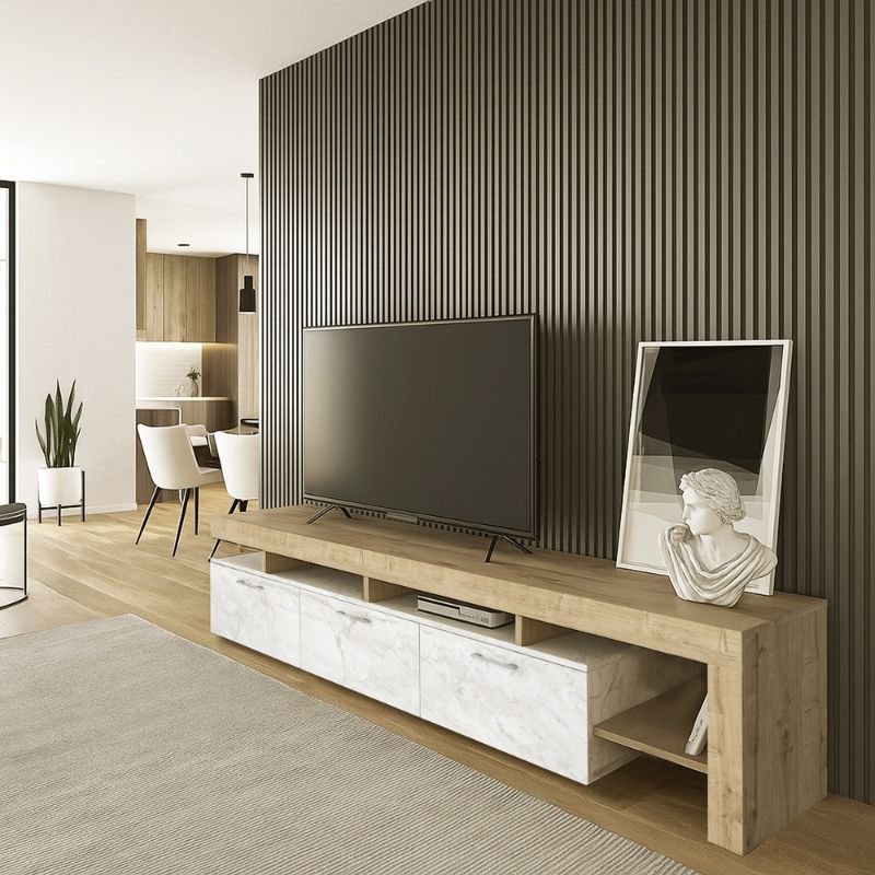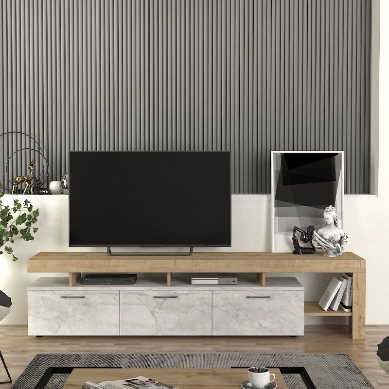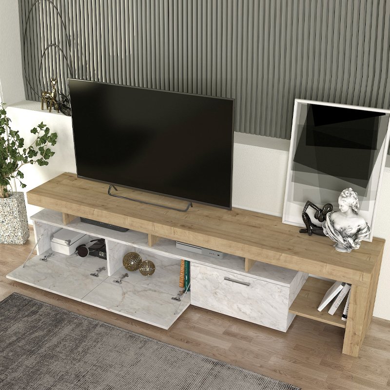Έπιπλο τηλεόρασης Acnes Megapap χρώμα λευκό εφέ μαρμάρου – sapphire oak 220x40x52εκ.