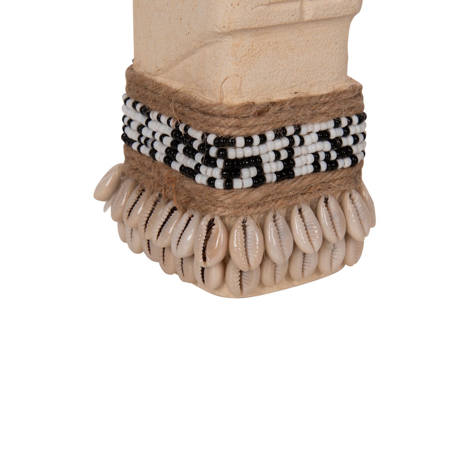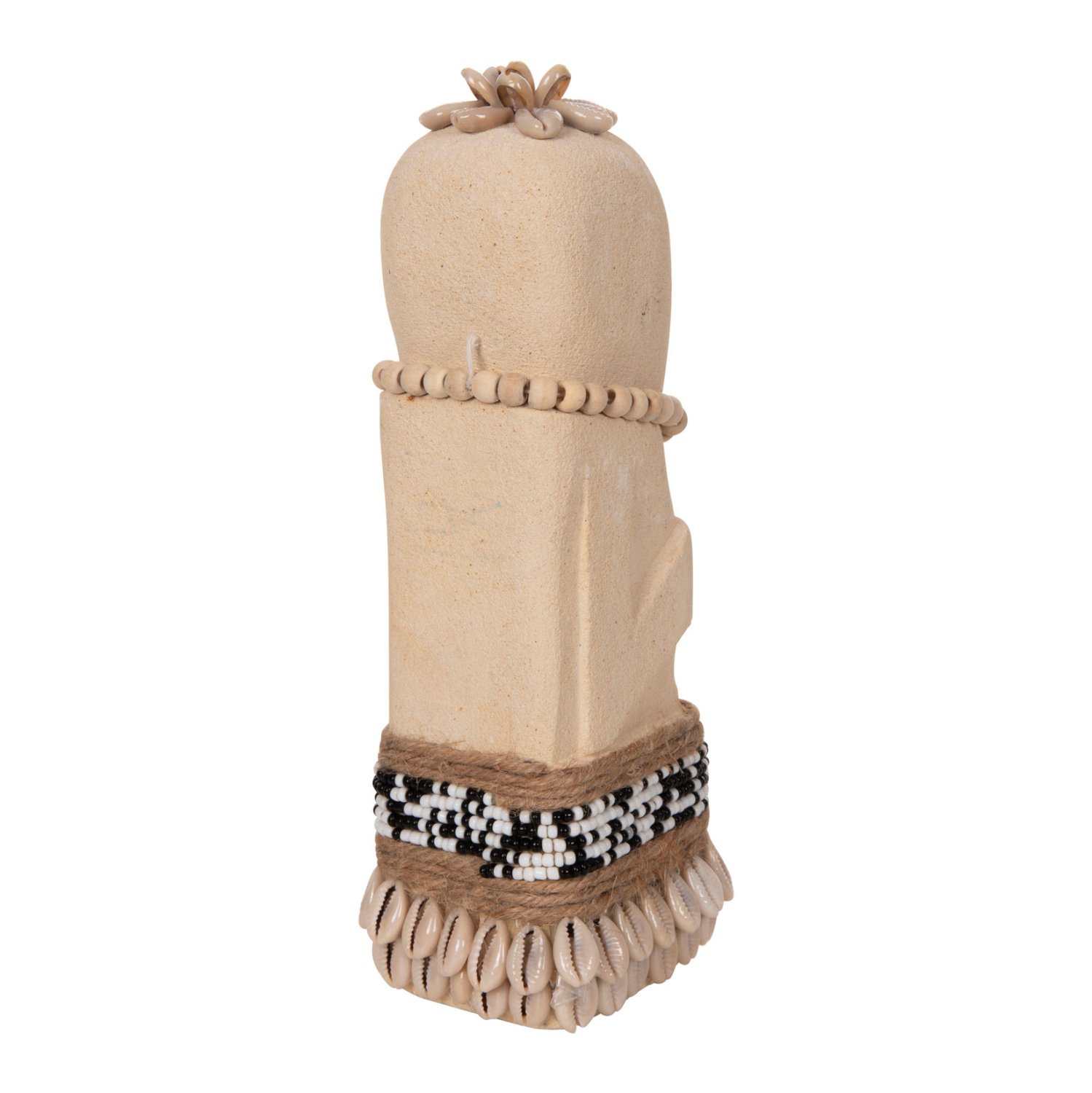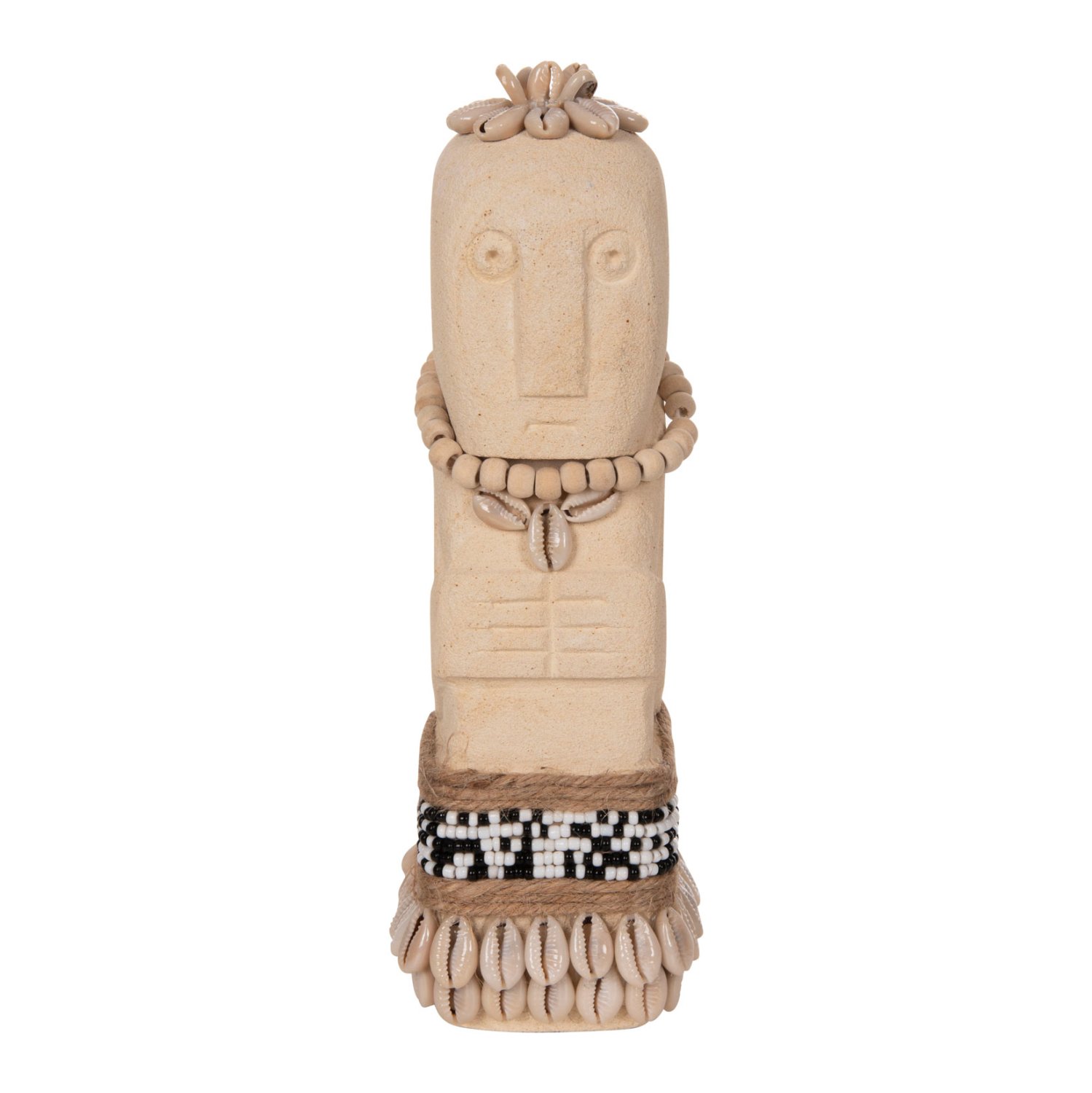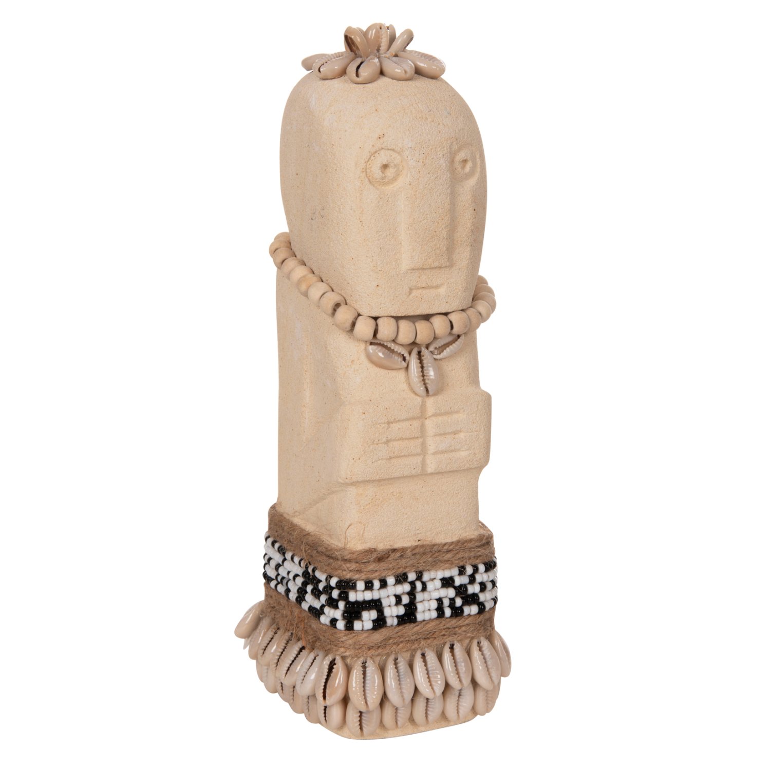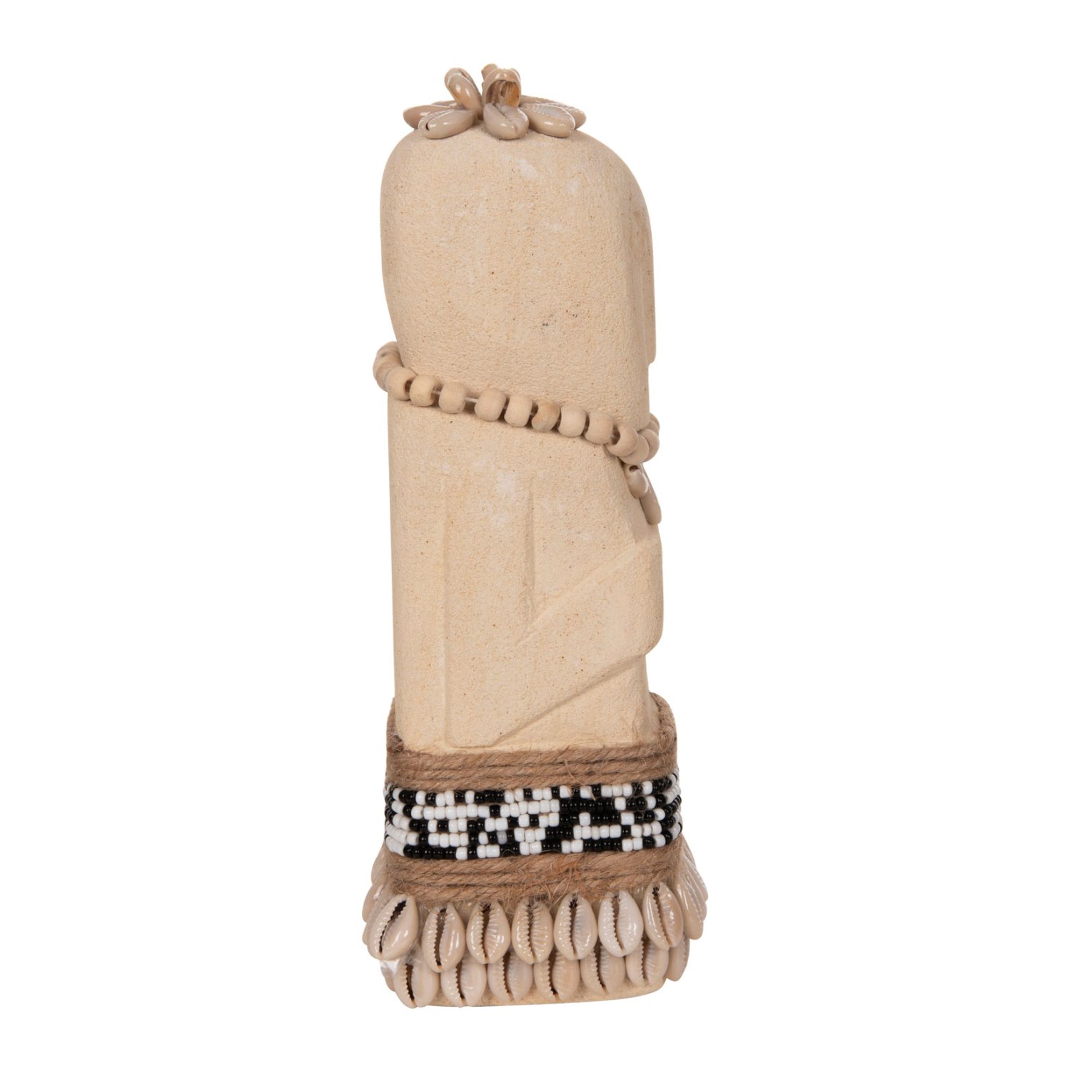 Το επιτραπέζιο διακοσμητικό SUMBA θα δώσει μια άλλη «αύρα» στον χώρο σας. Πρόκειται για ένα μακρόστενο αγαλματίδιο Πολυνησιακής τεχνοτροπίας (μορφή Μοάι), σε ΛΕΥΚΗ απόχρωση, διακοσμημένο με χάντρες και σχοινί από seagrass. Αυτό που κάνει όμως το ΗΜ4308 να ξεχωρίζει είναι η σημειολογία του. Είναι κατασκευασμένο από PARAS STONE, το οποίο στα ελληνικά αποδίδεται ως «τυχερή πέτρα» και λέγεται ότι φέρνει τύχη στον κάτοχό του. Προέρχεται από την Ινδική μυθολογία στην οποία το PARAS STONE είχε την ιδιότητα να μετατρέπει οποιοδήποτε αντικείμενο σε χρυσό.