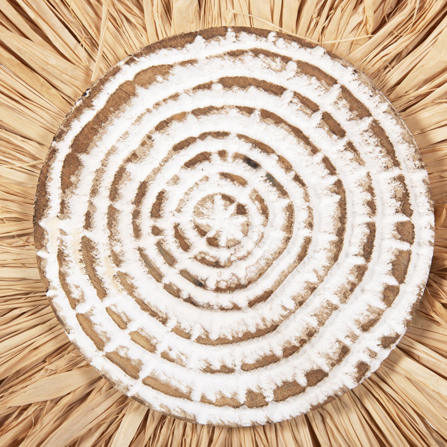 Αυτό το επιτραπέζιο διακοσμητικό σε στρόγγυλο σχήμα, είναι κατασκευασμένο από αποξηραμένες ίνες raffia, και είναι τοποθετημένο σε μια μαύρη ξύλινη βάση. Η ίνα raffia λαμβάνεται με το ξεφλούδισμα των φύλλων φοίνικα ραφίας. Οι φοίνικες Raffia είναι ένα γένος περίπου είκοσι ειδών φοινίκων που προέρχονται από τροπικές περιοχές της Αφρικής, και ιδιαίτερα της Μαδαγασκάρης, με ένα είδος να εμφανίζεται επίσης στην Κεντρική και Νότια Αμερική. Η ίνα ραφίας είναι μαλακή, εύκαμπτη, ισχυρή και ανθεκτική.