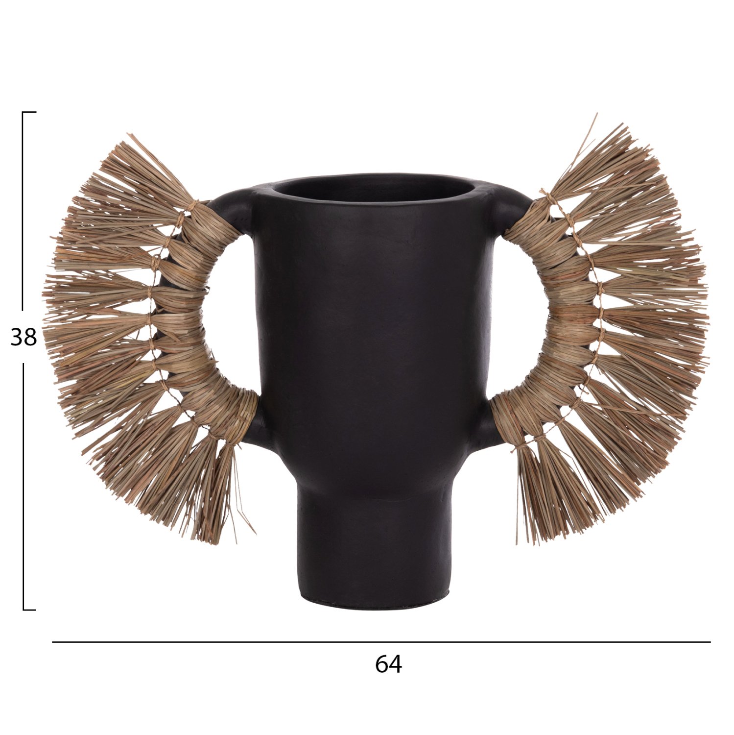 Το επιτραπέζιο χειροποίητο διακοσμητικό βάζο ALICA είναι ένα πολύ ιδιαίτερο διακοσμητικό στοιχείο για κάθε χώρο. Είναι κατασκευασμένο εξολοκλήρου από τερακότα σε ΜΑΥΡΟ χρώμα, ενώ διαθέτει και δύο χερούλια επενδυμένα με αποξηραμένο grass, και ένα φαρδύ στόμιο.