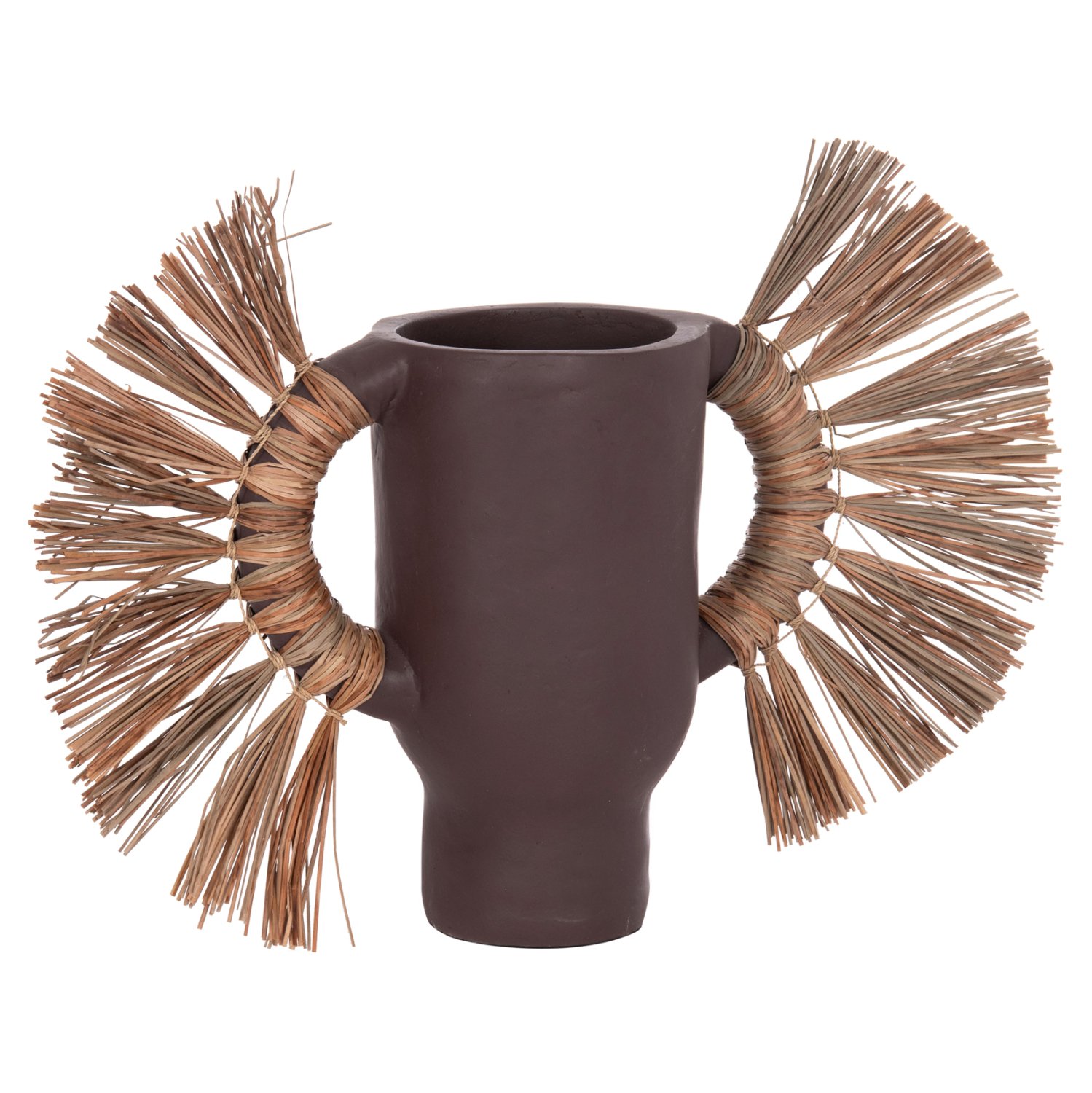 Το επιτραπέζιο χειροποίητο διακοσμητικό βάζο ALICA είναι ένα πολύ ιδιαίτερο διακοσμητικό στοιχείο για κάθε χώρο. Είναι κατασκευασμένο εξολοκλήρου από τερακότα σε ΣΟΚΟΛΑΤΙ χρώμα, ενώ διαθέτει και δύο χερούλια επενδυμένα με αποξηραμένο grass, και ένα σχετικά φαρδύ στόμιο.