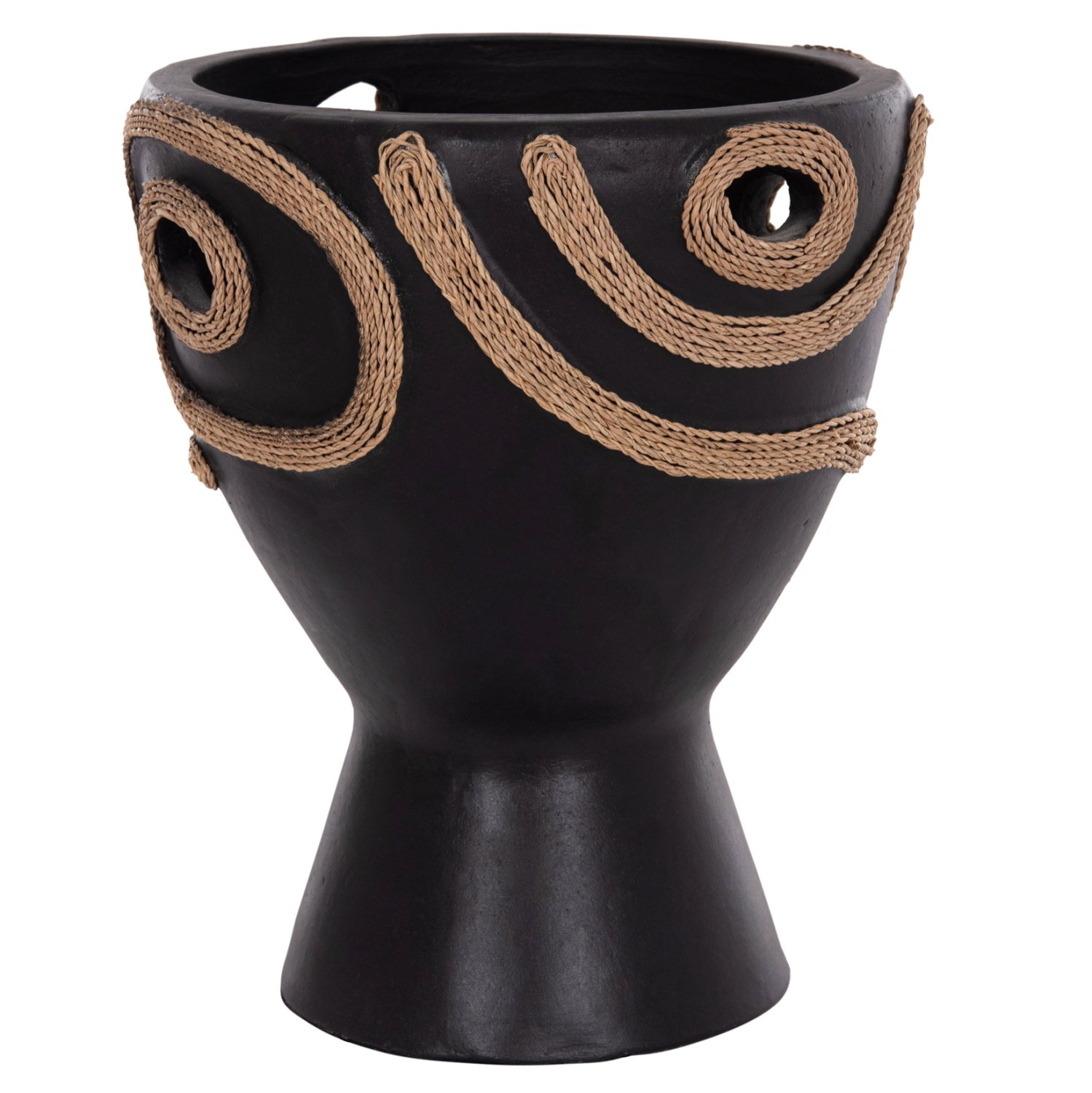 Το επιτραπέζιο χειροποίητο διακοσμητικό βάζο DEAN έχει το σχήμα μεγάλου κύπελλου. Είναι κατασκευασμένο εξολοκλήρου από τερακότα σε ΜΑΥΡΟ χρώμα ενώ διαθέτει διακοσμητικά σχέδια με σχοινί από ίνες φοίνικα κολλημένο στις πλευρές του βάζου. Ιδανικό για πληθώρα χώρων, τόσο για το σπίτι, όσο και για επαγγελματικούς χώρους.