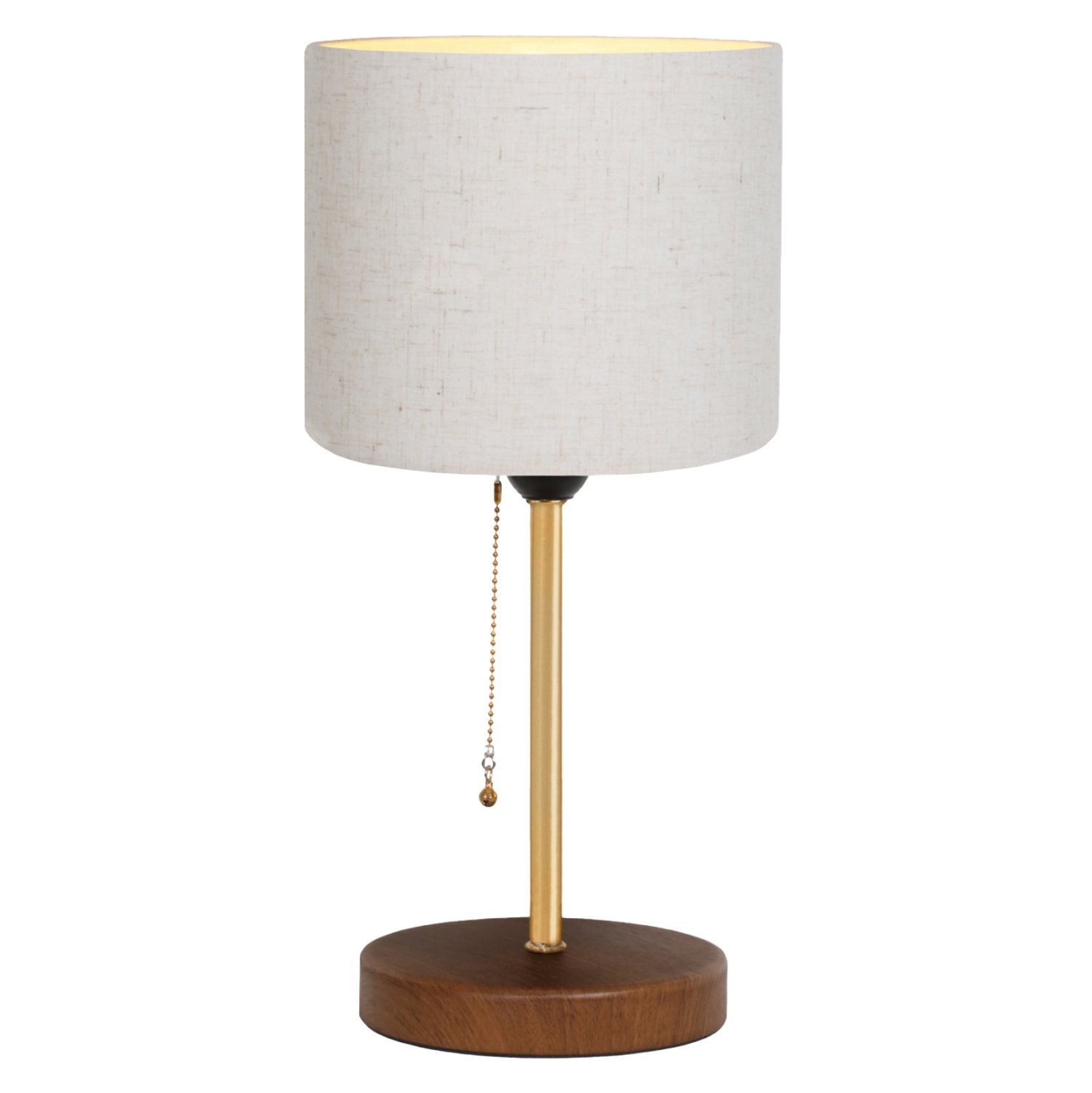 Επιτραπέζιο διακοσμητικό φωτιστικό με ξύλινη κυκλική βάση σε καφέ χρώμα και «καπέλο» κυλινδρικό σε χρώμα εκρου. Η λεπτομέρεια που το κάνει να ξεχωρίζει είναι ότι ο διακόπτης του φωτιστικού είναι σε στυλ παραδοσιακού κρεμαστού διακόπτη δίπλα στον λαμπτήρα σε χρυσή αλυσιδούλα. Το φως του φωτιστικού διαχέεται γλυκά στον χώρο και από πάνω και από κάτω και δημιουργεί μια ζεστή ατμόσφαιρα. Αυτού του είδους τα φωτιστικά δεν προορίζονται για φωτιστικά διαβάσματος και αυτό πρέπει πάντα να λαμβάνεται υπόψη κατά την επιλογή τους. Είναι καθαρά διακοσμητικά και το ταίριασμά τους με τον περιβάλλοντα χώρο θα πρέπει να είναι αρμονικό. Αυτό το φωτιστικό είναι λιτό, κομψό και βολικό σε διαστάσεις παρέχοντας αμέτρητες δυνατότητες «δεσίματος» με την υπόλοιπη διακόσμησή σας. Είναι ένα μικρό έργο τέχνης.