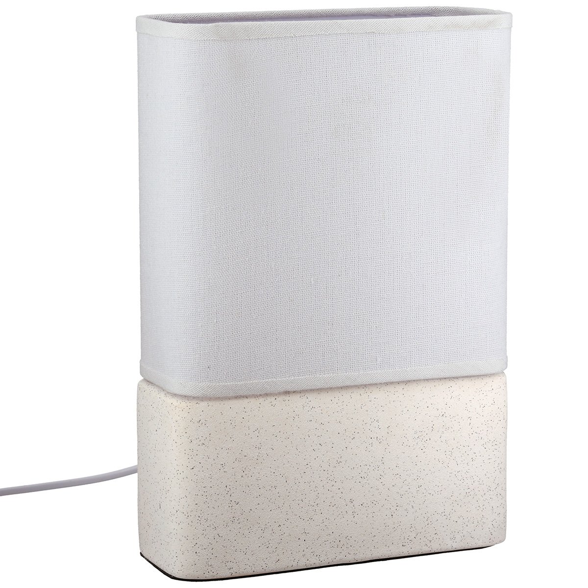 Επιτραπέζιο φωτιστικό σε ορθογώνιο σχήμα με κεραμική βάση σε μπεζ απόχρωση και λευκό υφασμάτινο καπέλο. Ιδανικό για κομοδίνο, τραπέζι ή βοηθητικό έπιπλο, προσθέτει διακριτική φωτεινότητα και μοντέρνα αισθητική σε κάθε χώρο.