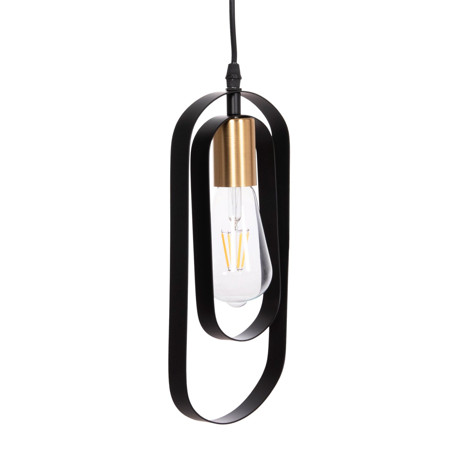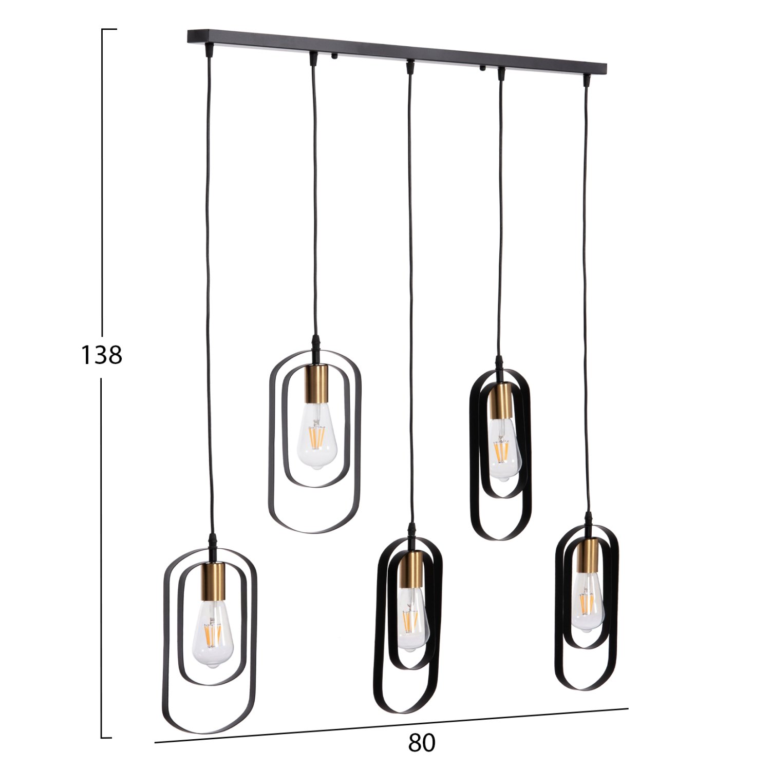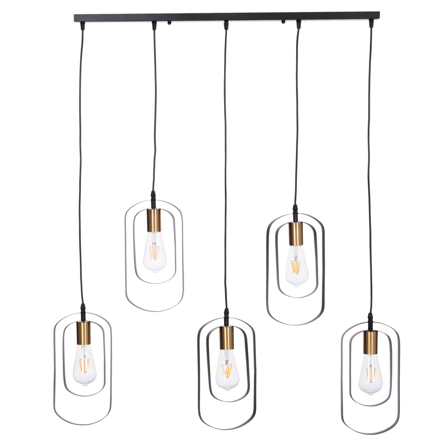 Αυτό το κρεμαστό φωτιστικό οροφής BIUT είναι ένα 5-φωτο κρεμαστό σε διαφορετικά εναλλασσόμενα ύψη με μαύρη ορθογώνια βάση οροφής και μαύρα καλώδια κρέμασης. Οι λάμπες τοποθετούνται σε ντουί χρυσού χρώματος ενώ αυτό που τραβάει τα βλέμματα είναι το minimal design των καπέλων με τα δύο μεταλλικά πλαίσια.