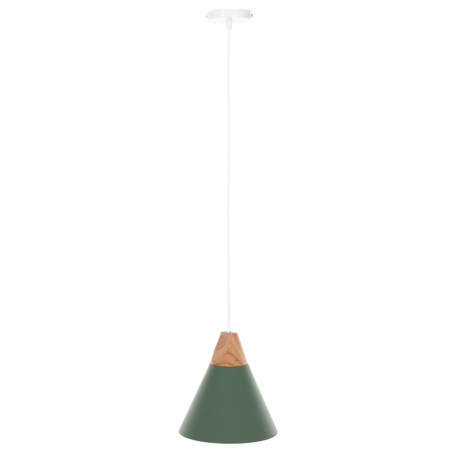 Ανακαλύψτε αυτό το νέο μας κρεμαστό φωτιστικό οροφής και ολοκληρώστε την διακόσμησή σας. Πρόκειται για ένα φωτιστικό με ΠΡΑΣΙΝΟ μεταλλικό καπέλο σε σχήμα καμπάνας με λεπτομέρεια ξύλου στην κορυφή του φωτιστικού. Αισθητικά, ολοκληρώνεται με το λευκό καλώδιο κρέμασης και την λευκή βάση οροφής, και αποτελεί την τελευταία τάση στα φωτιστικά οροφής.