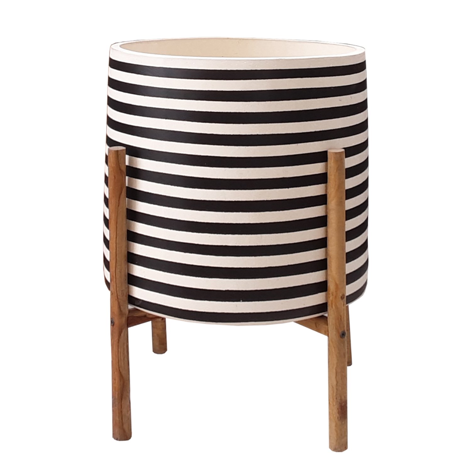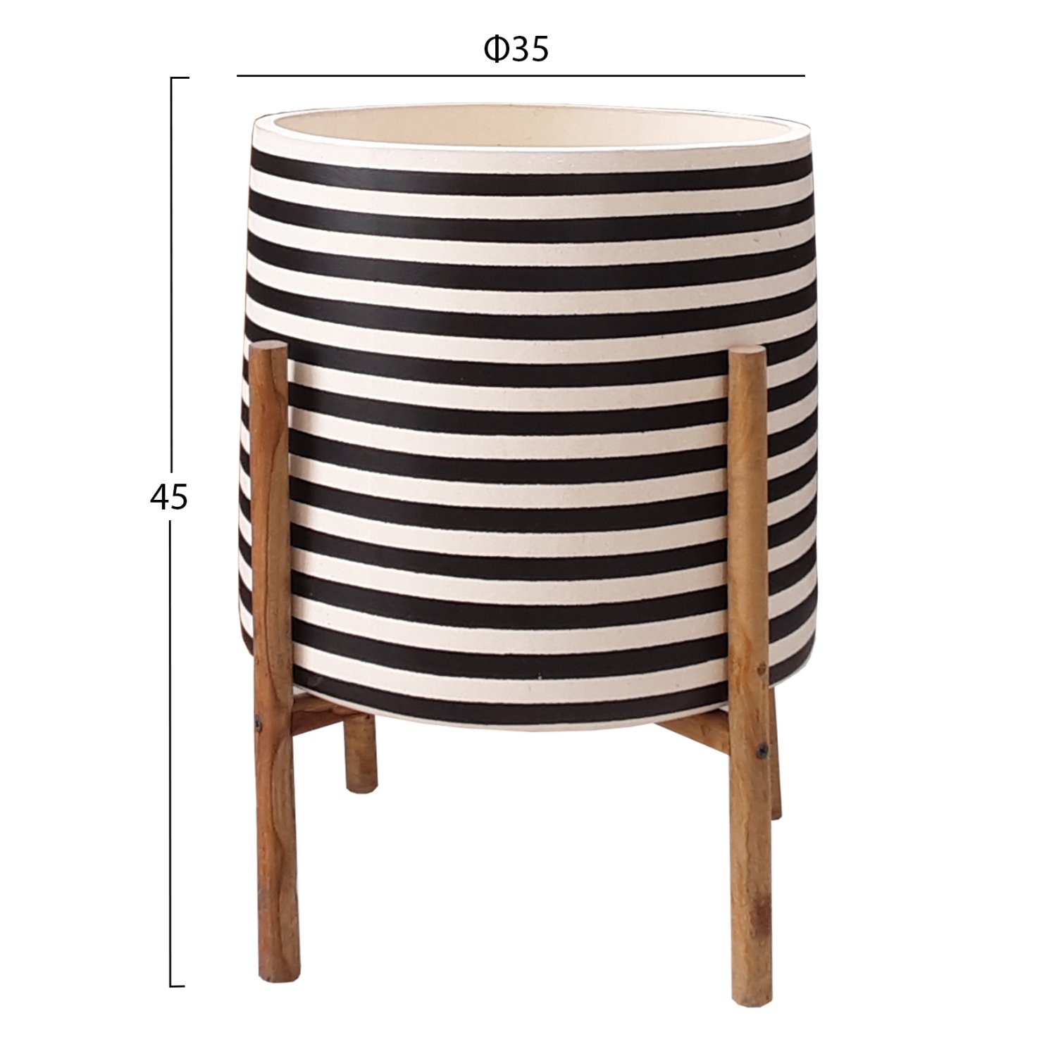 Η γλάστρα εσωτερικού χώρου (κασπό) RENTIL είναι κατασκευασμένη από Fiber Cement σε ΛΕΥΚΟ και ΜΑΥΡΟ χρώμα σε ρίγες. Το ιδιαίτερο χαρακτηριστικό της είναι ότι συνοδεύεται και τοποθετείται σε μια χαμηλή χιαστί βάση από ξύλο teak. Συνιστάται η τοποθέτηση εσωτερικού δοχείου εάν πρόκειται να την χρησιμοποιήσετε με νερό!
