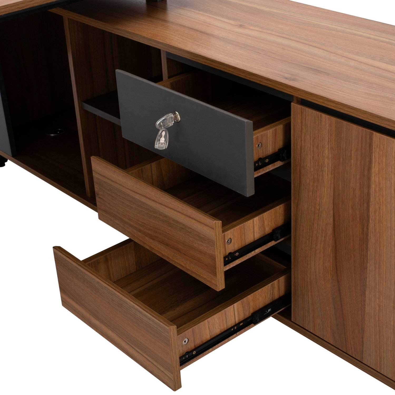 Διαθέτει ένα ντουλάπι με ράφι, ένα συρτάρι με κλειδαριά και δύο χωρίς και τρεις ανοιχτούς αποθηκευτικούς χώρους.