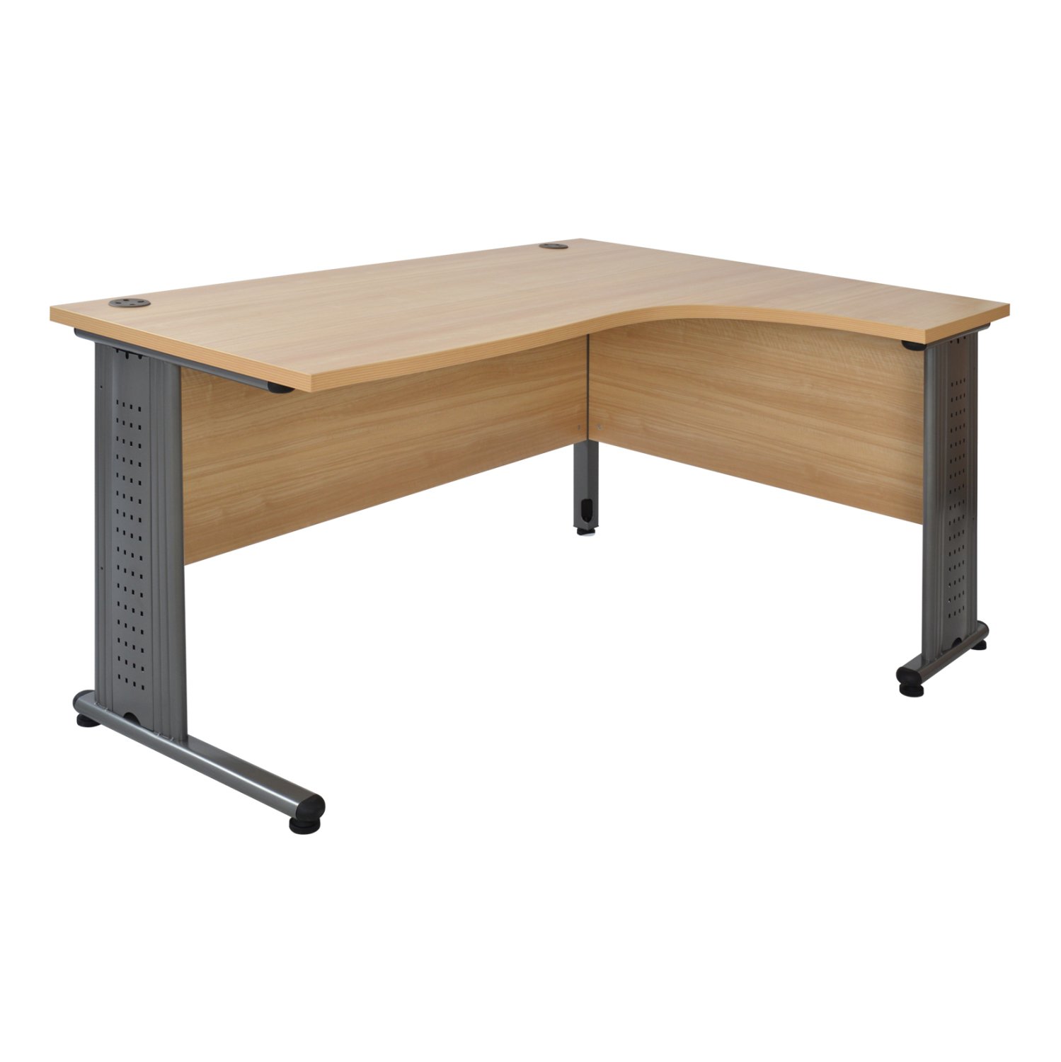 Με δύο εισόδους καλωδίων και πόδια μεταλλικά 3τμχ(στις 3 γωνίες του γραφείου) σε χρώμα γκρι.