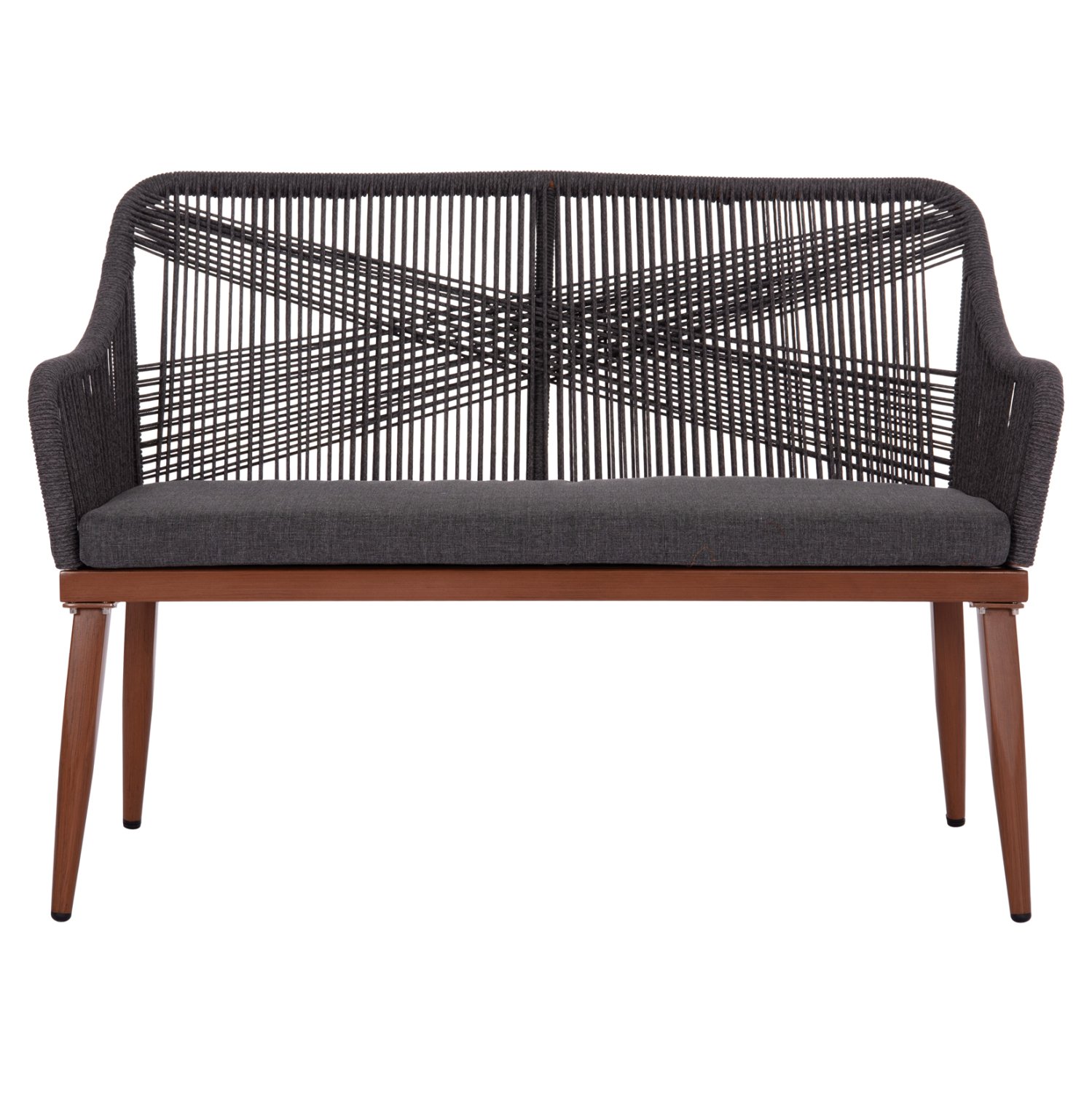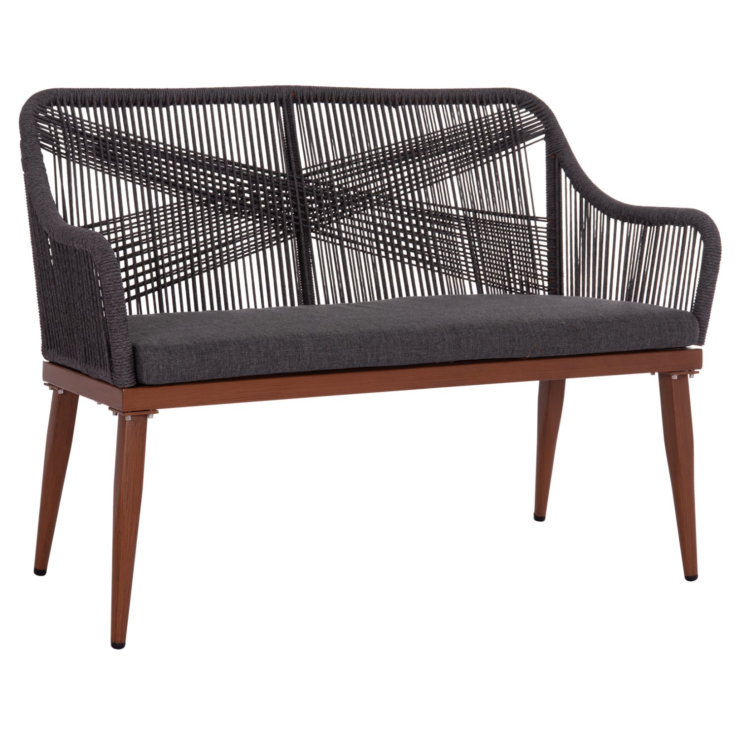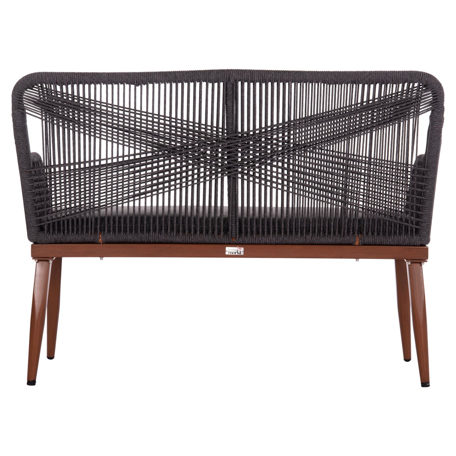 Ο 2-θέσιος καναπές εξωτερικού χώρου MYRTIA είναι εξαιρετικός και συνδυάζει τον σκελετό αλουμινίου σε ΚΑΦΕ χρώμα με το ΑΝΘΡΑΚΙ textilene σχοινί που διατρέχει πλεγμένο όλο τον καναπέ. Το μαξιλάρι καθίσματος είναι επενδυμένο με πολυεστερικό ύφασμα σε ΑΝΘΡΑΚΙ χρώμα. Χαρακτηριστικό γνώρισμα αυτού του καναπέ είναι ότι τα πόδια είναι ψηλά, με αποτέλεσμα και το ύψος του καθίσματος να είναι ψηλό.