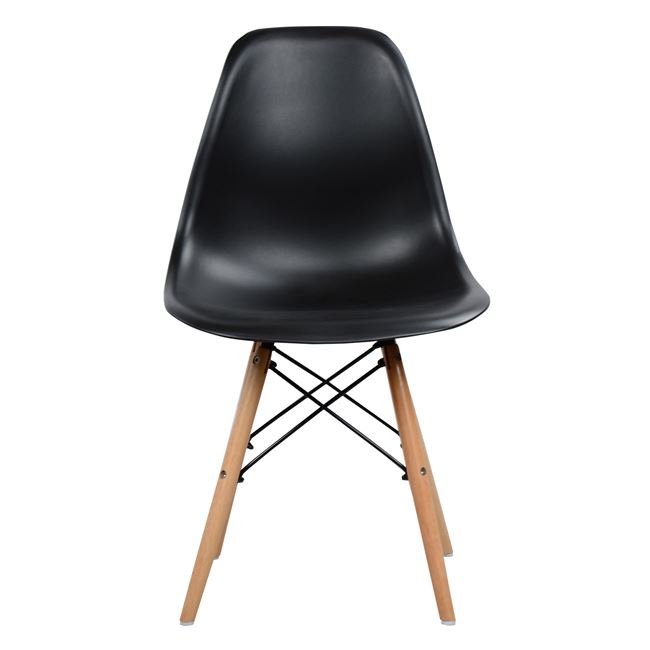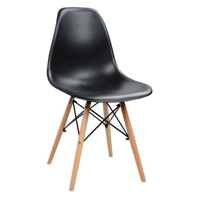 Μία μοντέρνα καρέκλα κατασκευασμένη από ξύλινο σκελετό και κάθισμα πολυπροπυλενίου σε μαύρη απόχρωση.