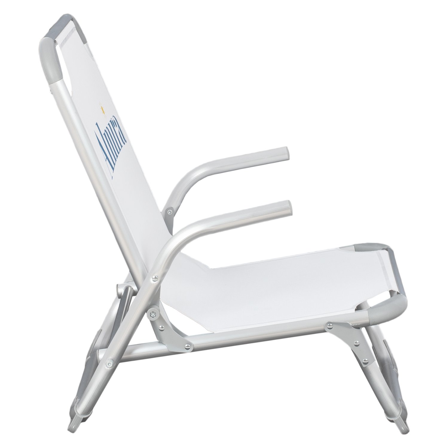 Καρεκλάκι παραλίας ΒΑΡΕΩΣ ΤΥΠΟΥ από αλουμίνιο με ψηλή πλάτη σε λευκή απόχρωση.