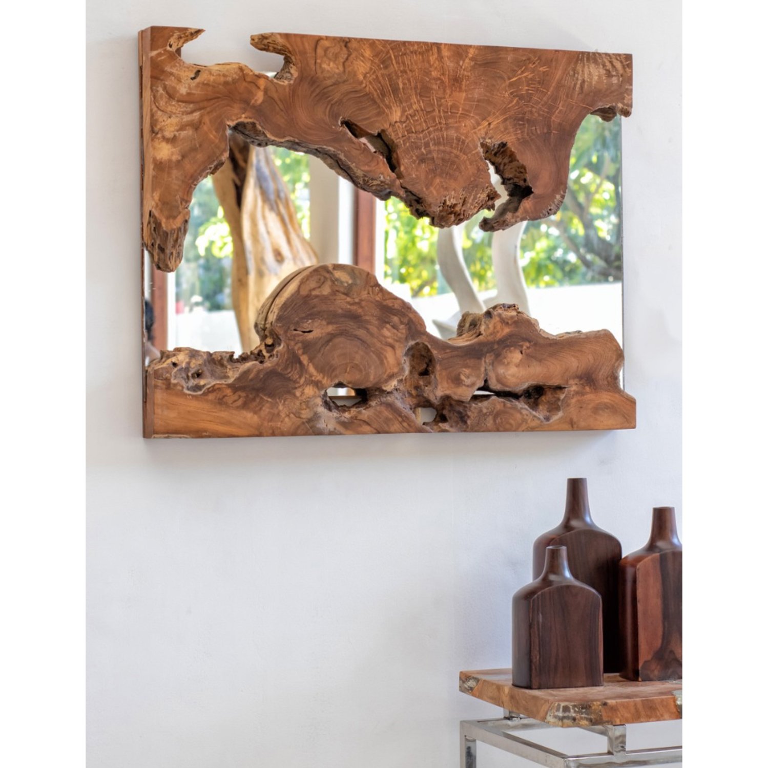 O καθρέπτης ΗΜ9361 είναι πραγματικά ένα εντυπωσιακό κομμάτι στην διακόσμηση του σπιτιού σας! Το design του είναι μοναδικό με τον καθρέφτη να βρίσκεται σε ένα τετράγωνο πλαίσιο από μασίφ κομμάτια ξύλου ΤΕΑΚ. Αισθητικά αποτελεί κυρίως ένα κομμάτι διακόσμησης παρά ένας κανονικός καθρέπτης, μαγνητίζοντας τα βλέμματα. Τα ξύλα είναι στο φυσικό τους χρώμα και οι διαστάσεις όλης της κατασκευής είναι ικανοποιητικές.