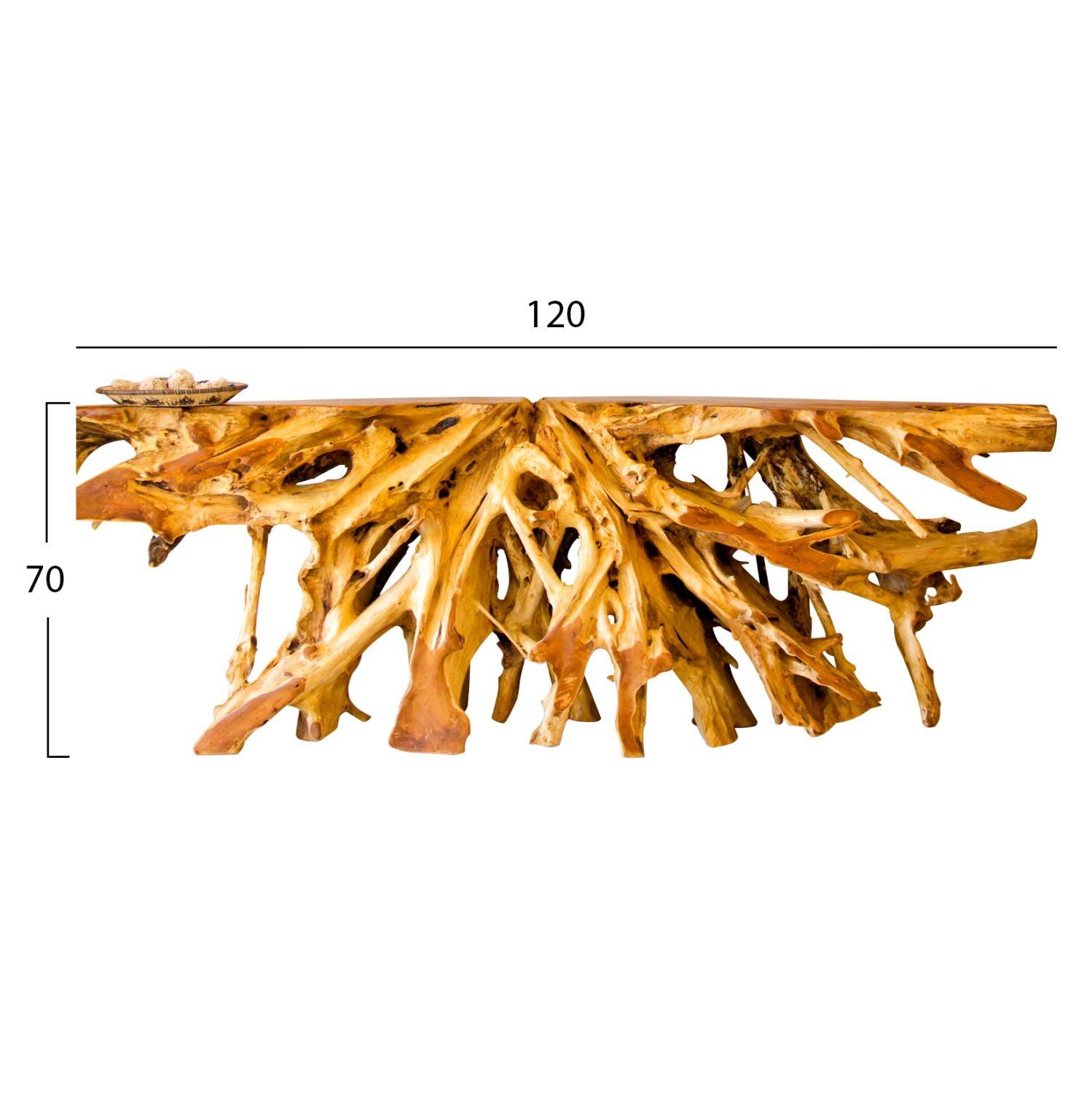 Η κονσόλα είναι κατασκευασμένη από την μασίφ ρίζα του δέντρου ΤΕΑΚ. Το μασίφ συνιστά ένα είδος ξύλου, καθαρό και ατόφιο, που παραδοσιακά χρησιμοποιούν οι μαραγκοί για την κατασκευή επίπλων. Το μασίφ είναι η πιο ακριβή επιλογή σε είδος ξύλου αλλά ξεχωρίζει για την διαχρονική αισθητική του. Το αποτέλεσμα που προσφέρει στον κάτοχό του είναι πραγματικά μοναδικό.