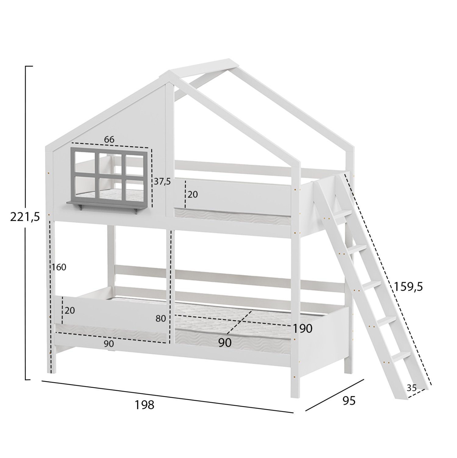 Η παιδική κουκέτα COMBO σε διάσταση για στρώματα 90×190εκ, είναι κατασκευασμένη από ξύλο πεύκου σε ΛΕΥΚΟ χρώμα. Η κουκέτα που έχει σχήμα σπιτιού με παράθυρο διαθέτει περιμετρικά κάγκελα και πλαϊνή σκάλα πρόσβασης στο επάνω κρεβάτι, ενώ τα στρώματα τοποθετούνται σε τάβλες από κόντρα-πλακέ ξυλεία.