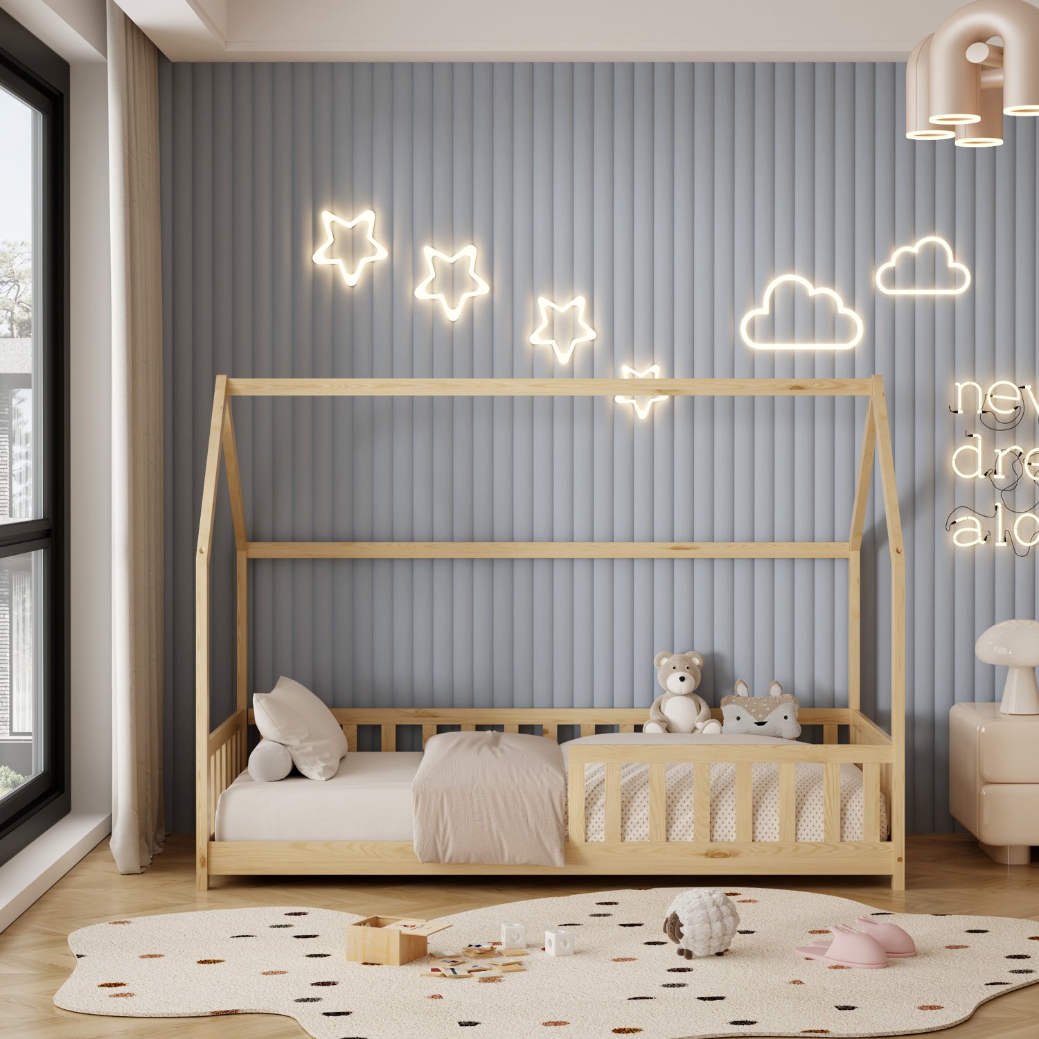 Σας παρουσιάζουμε το καινούργιο παιδικό κρεβάτι PHYLLIS τύπου Montessori που σημαίνει ότι έχει σχεδιαστεί σύμφωνα με το εκπαιδευτικό σύστημα Montessori, σύμφωνα με το οποίο τα παιδιά μαθαίνουν καλύτερα, όταν επιλέγουν μόνα τους τι θα κάνουν. Το χαμηλό ύψος κρεβατιού χωρίς πόδια, βοηθά να εξερευνούν την αυτονομία τους και να ανεβοκατεβαίνουν από το κρεβάτι τους ελεύθερα ανά πάσα στιγμή. Είναι σε διάσταση για μονό στρώμα 90×190 εκ, και αποτελεί μια άριστης ποιότητας, μοντέρνα και ασφαλή επιλογή για το παιδικό δωμάτιο μιας και διαθέτει ξύλινο κάγκελο περιμετρικά. Είναι ξύλινο σε ΦΥΣΙΚΟ χρώμα βαμμένο με αβλαβές βερνίκι με βάση το νερό και μη τοξικό, ιδανικό για παιδιά. Το στρώμα τοποθετείται σε τάβλες κατασκευασμένες από ξυλεία κόντρα πλακέ. Ολόκληρο το κρεβάτι έχει σχήμα σπιτιού και μάλιστα αρκετά ψηλό, που θα δώσει μια ευχάριστη, «ζεστή», και παιχνιδιάρικη όψη σε κάθε παιδικό δωμάτιο.