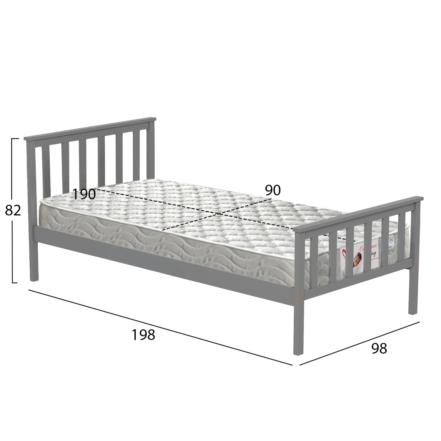Το παιδικό κρεβάτι GIMLY σε διάσταση για στρώμα 90×190 εκ, είναι κατασκευασμένο από ξύλο πεύκου σε ΓΚΡΙ χρώμα, με ψηλά πόδια, ενώ το στρώμα τοποθετείται σε τάβλες από κόντρα-πλακέ ξυλεία.