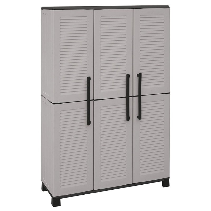 Ντουλάπα πλαστική τρίφυλλη με πόδια για εξωτερικούς χώρους. Ανθεκτική σε καιρικές συνθήκες χάρη στην επάνω επιφάνεια της ντουλάπας που καλύπτει τα φύλλα προστατεύοντάς το περιεχόμενο της. Διαθέτει ανοιγόμενα φύλλα και 3 εσωτερικά ράφια αποθήκευσης ώστε να εφαρμόζουν στο επιθυμητό ύψος και εσωτερικό χώρισμα δίνοντας τη δυνατότητα να αποθηκεύονται ψηλά αντικείμενα και οικιακές συσκευές όπως εργαλεία, σκούπες, σφουγγαρίστρες κλπ.