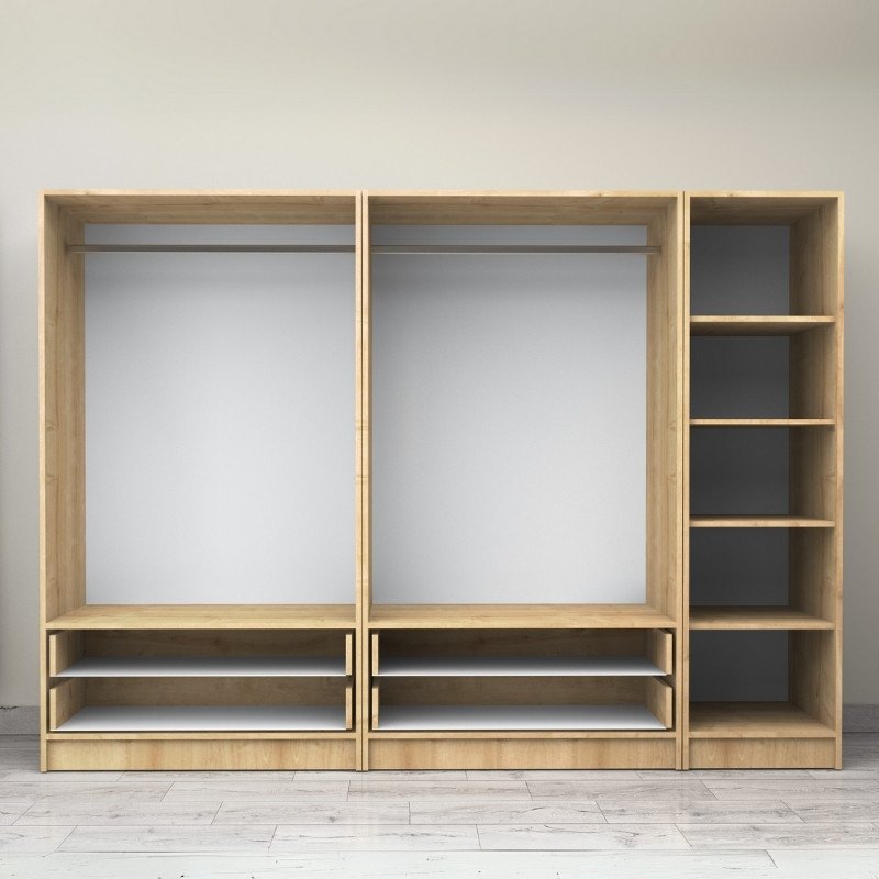- Στο εσωτερικό της φέρει δύο μεταλλικές βέργες για κρεμάστρες και ράφια για μεγαλύτερη αποθήκευση. Στο κάτω μέρος φέρει τέσσερα πρακτικά συρόμενα συρτάρια.