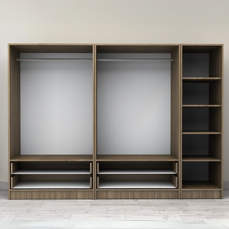- Στο εσωτερικό της φέρει δύο μεταλλικές βέργες για κρεμάστρες και ράφια για μεγαλύτερη αποθήκευση. Στο κάτω μέρος φέρει τέσσερα πρακτικά συρόμενα συρτάρια.