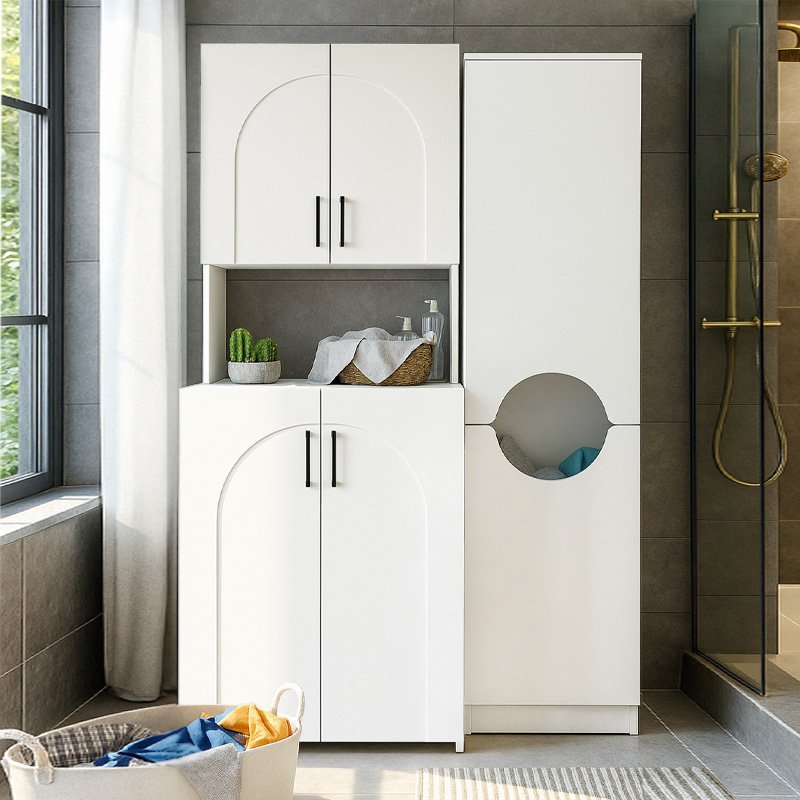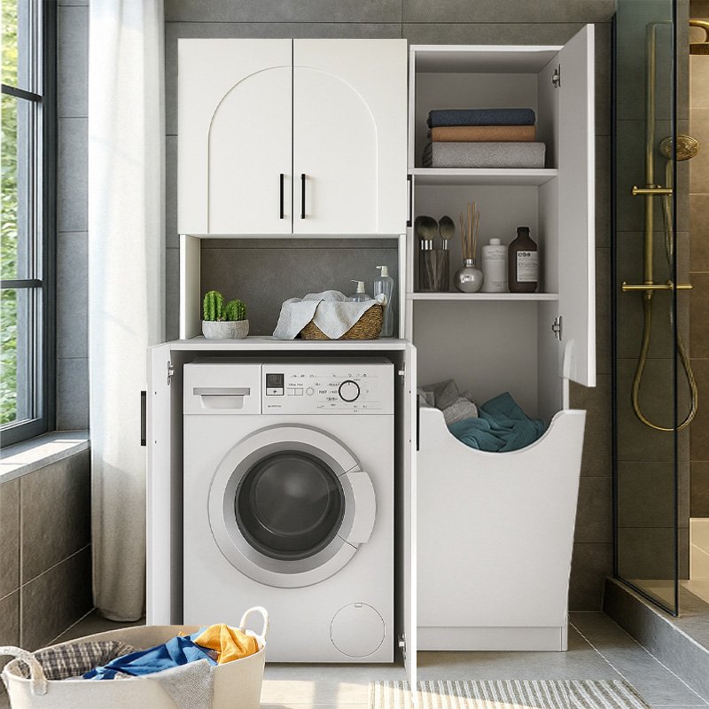 - Διαθέτει ενα ντουλάπι με ράφια και ένα ντουλάπι με καλάθι απλύτων.