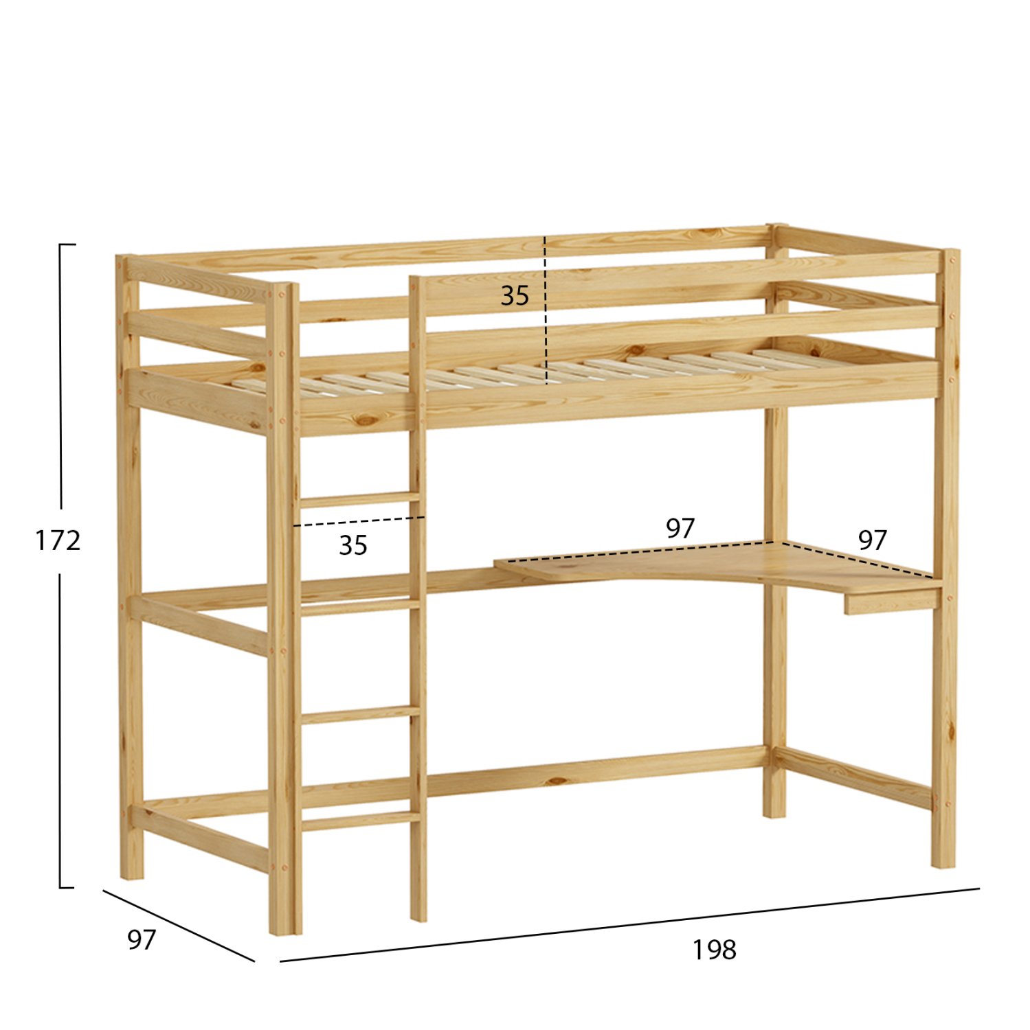 Σας παρουσιάζουμε το καινούργιο παιδικό κρεβάτι-κουκέτα AKRON σε διάσταση για μονό στρώμα 90×190 εκ, και αποτελεί μια άριστης ποιότητας, μοντέρνα και ασφαλή επιλογή για το παιδικό δωμάτιο. Είναι ξύλινο σε ΦΥΣΙΚΟ χρώμα βαμμένο με αβλαβές βερνίκι με βάση το νερό και μη τοξικό, ιδανικό για παιδιά. Το στρώμα τοποθετείται σε τάβλες κατασκευασμένες από ξυλεία κόντρα πλακέ. Η πρόσβαση στο κρεβάτι γίνεται με πρακτική σκάλα, ενώ στο κάτω μέρος υπάρχει γωνιακό γραφείο. Μια ιδανική πρόταση για δωμάτια με περιορισμένο χώρο.