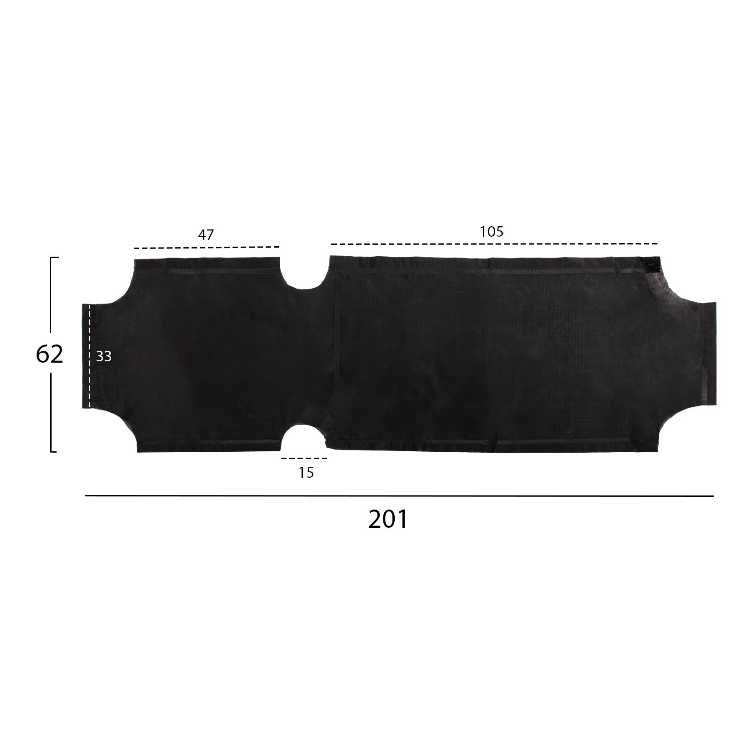 Το πανί αυτό είναι ανταλλακτικό πανί για κλασικές ξαπλώστρες επαγγελματικού τύπου, και είναι σε ΜΑΥΡΟ χρώμα. Αποτελείται από ένα ενιαίο κομμάτι ενώ στην περιοχή του καθίσματος διαθέτει και δεύτερη στρώση textilene θερμοκολλημένη. Το υλικό του είναι TEXTILENE 2×1 στα 600gr/m2.