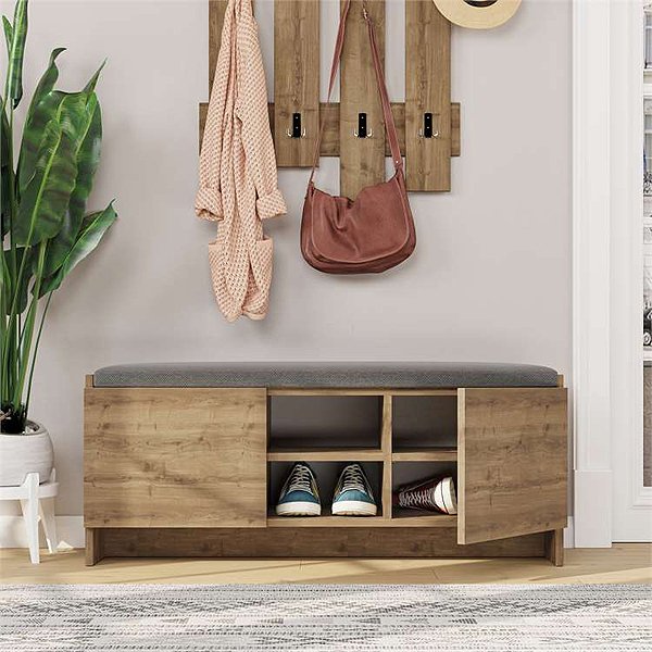 • Δεξιά κι αριστερά φέρει ντουλάπια, δύο ράφια στη μέση και κάθισμα.