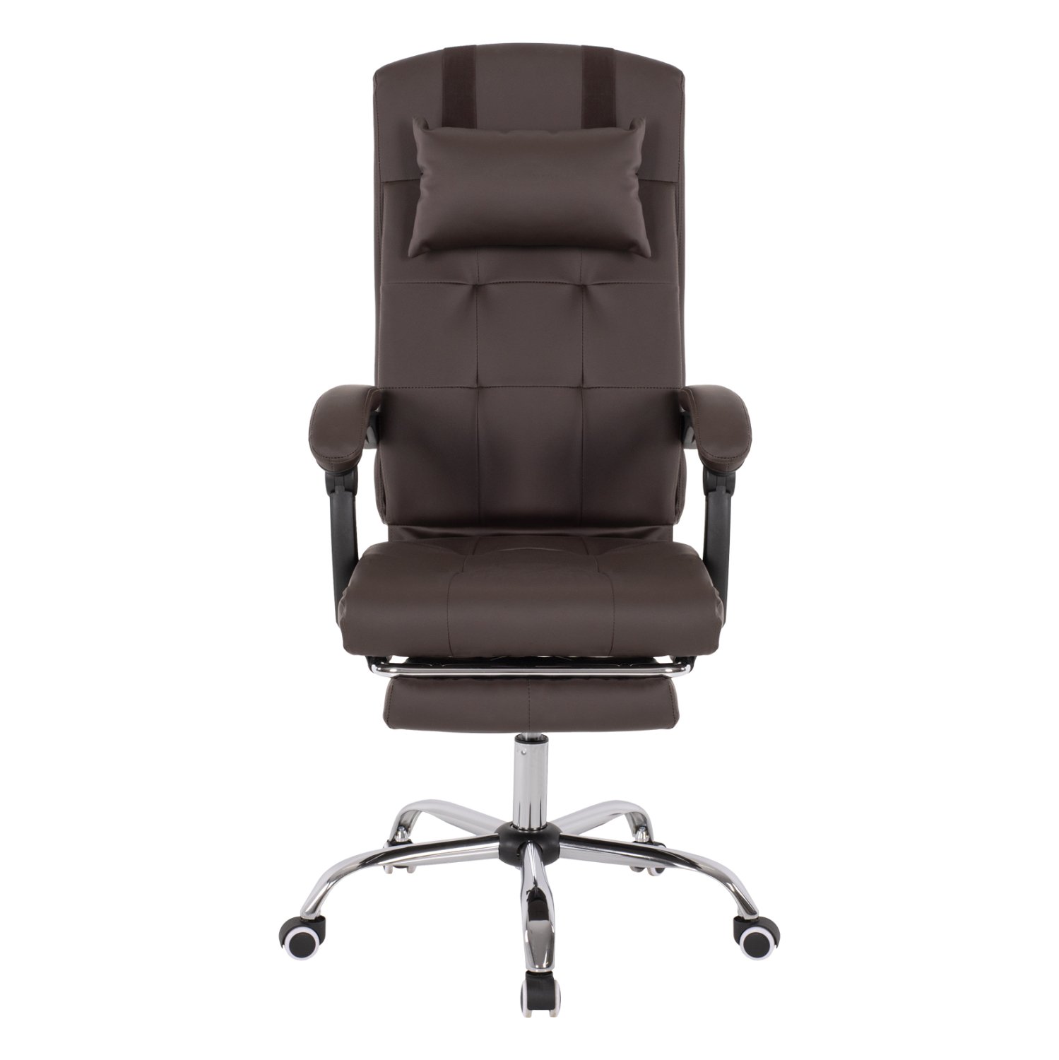 ΗΜ1057.19–Διευθυντική καρέκλα γραφείου σε ΚΑΦΕ χρώμα. Μια «πλούσια» και επιβλητική καρέκλα γραφείου με αναπαυτικά μπράτσα με εργονομική κλίση επενδυμένα με μαξιλαράκια. Η πλάτη είναι πολύ ψηλή ενώ έχει πλούσια στρώση από αφρώδη υλικά και έξτρα μαξιλαράκι στο επάνω μέρος της πλάτης για μεγαλύτερη άνεση κατά την χρήση. Υποστηρίζει ολόκληρο τον κορμό σας, ενώ είναι επενδυμένη με υψηλής ποιότητας PU δέρμα με καπιτονέ τεχνοτροπία, όπως επίσης και το φαρδύ και αναπαυτικό κάθισμα με την εξτρά αναπαυτική επιφάνεια. Η βάση είναι χρωμιωμένη σε σχήμα «αστέρι» με κυρτά πόδια και ασπρόμαυρα ροδάκια. Το χαρακτηριστικό, όμως, που κάνει αυτή την καρέκλα να ξεχωρίζει είναι ότι διαθέτει πτυσσόμενο υποπόδιο, το οποίο σε συνδυασμό με το γεγονός ότι η πλάτη «πέφτει» με μεγάλη κλίση, σας επιτρέπει να ξαπλώνετε και να ξεκουράζεστε όταν το επιθυμείτε!