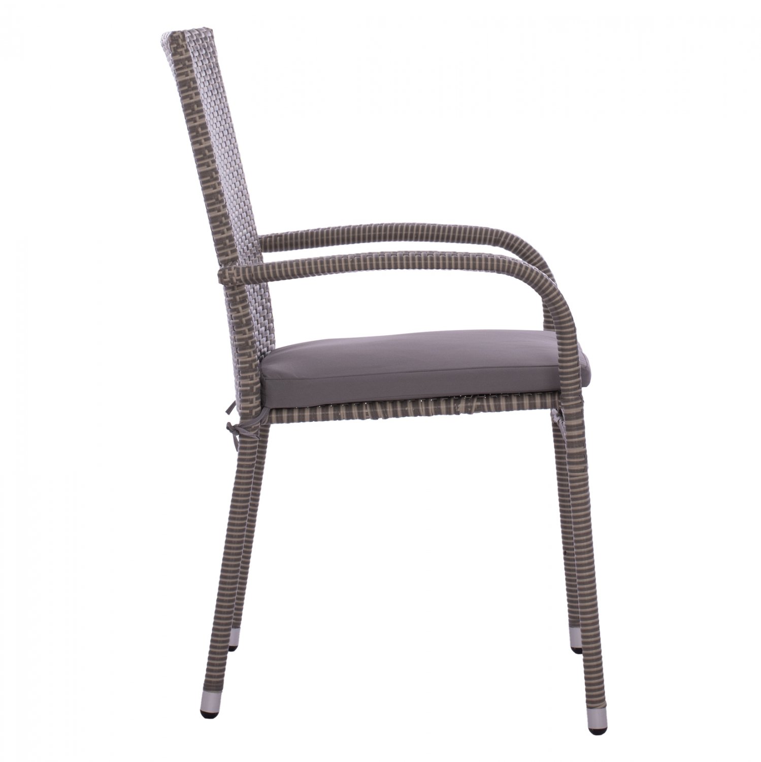 Μοντέρνα πολυθρόνα εξωτερικού χώρου, κατασκευασμένη από μεταλλικό σκελετό και επενδυμένη με πλεκτό wicker σε γκρι απόχρωση και γκρι μαξιλάρι.