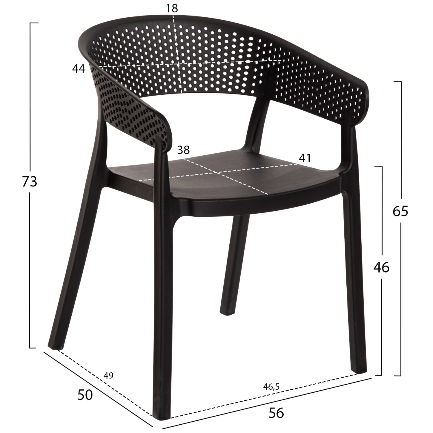 Πολυθρόνα πολυπροπυλενίου σε ΜΑΥΡΟ χρώμα. Ιδανική πρόταση για χρήση σε εξωτερικούς χώρους, είτε επαγγελματικούς (χώροι δεξιώσεων, εταιρείες catering, κλπ.) είτε για το σπίτι. Η πολυθρόνα αποτελείται από ένα λείο κάθισμα και μια ημικυκλική, ανεξάρτητη και «τρυπητή» πλάτη και μπράτσα. Είναι πανέμορφη και θα αναβαθμίσει αισθητικά κάθε εξωτερικό χώρο.