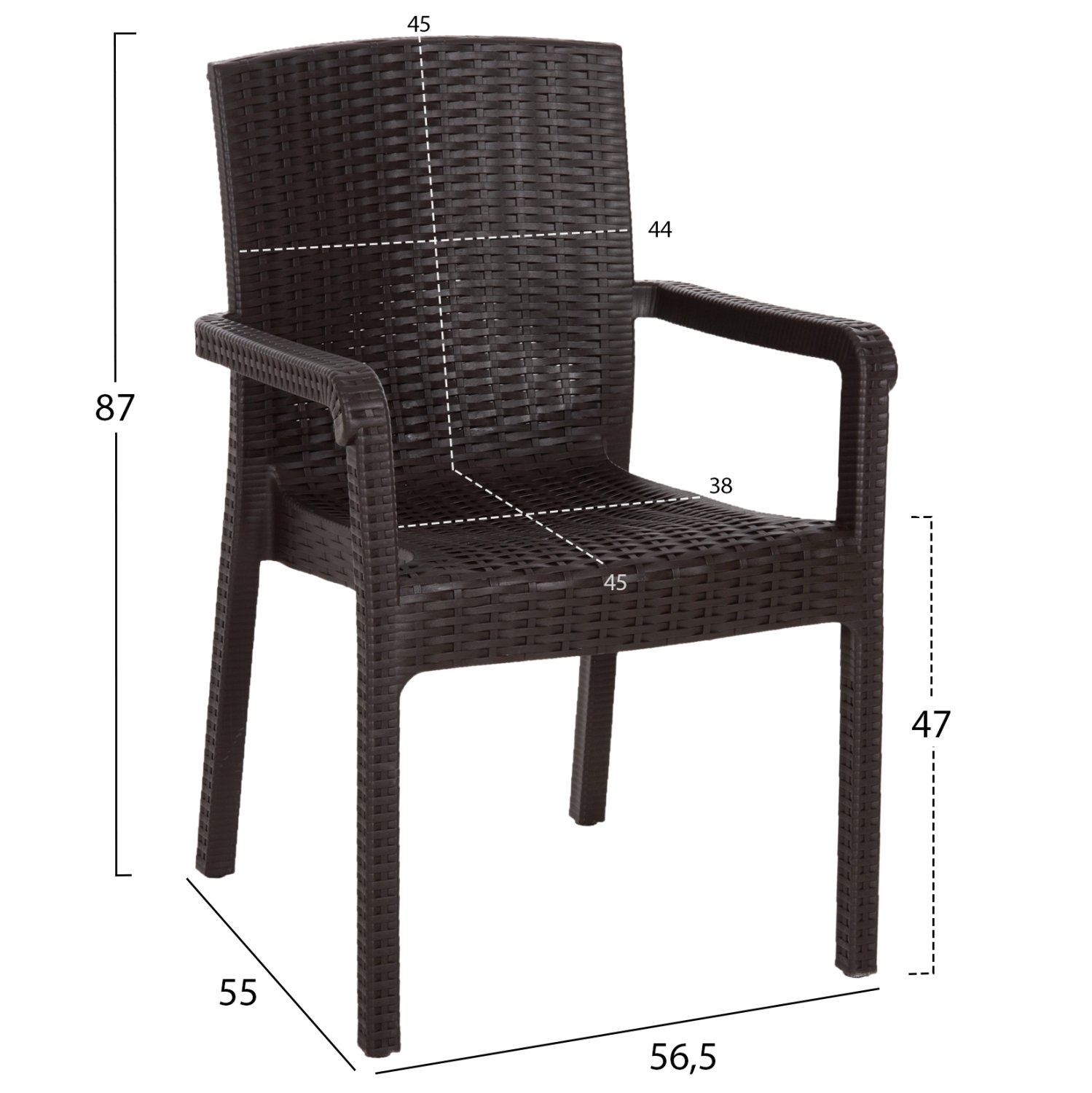 Η VECTOR είναι μια πολυθρόνα πολυπροπυλενίου σε ΚΑΦΕ χρώμα. Ιδανική πρόταση για χρήση σε εξωτερικούς χώρους, είτε επαγγελματικούς (χώροι δεξιώσεων, εταιρείες catering, κλπ.) είτε για το σπίτι. Η καρέκλα αποτελείται από ένα βαρέως τύπου χυτό σύνολο καθίσματος-πλάτης-μπράτσων-ποδιών σε στυλ wicker, ενώ τα μπράτσα είναι ψηλά με στρογγυλεμένες γωνίες προσφέροντας άνεση κατά την χρήση. Επίσης, η ψηλή πλάτη και το φαρδύ κάθισμα είναι ικανοποιητικού μεγέθους και είναι σίγουρο ότι θα ικανοποιήσουν όλους όσοι καθίσουν σε αυτή την καρέκλα.