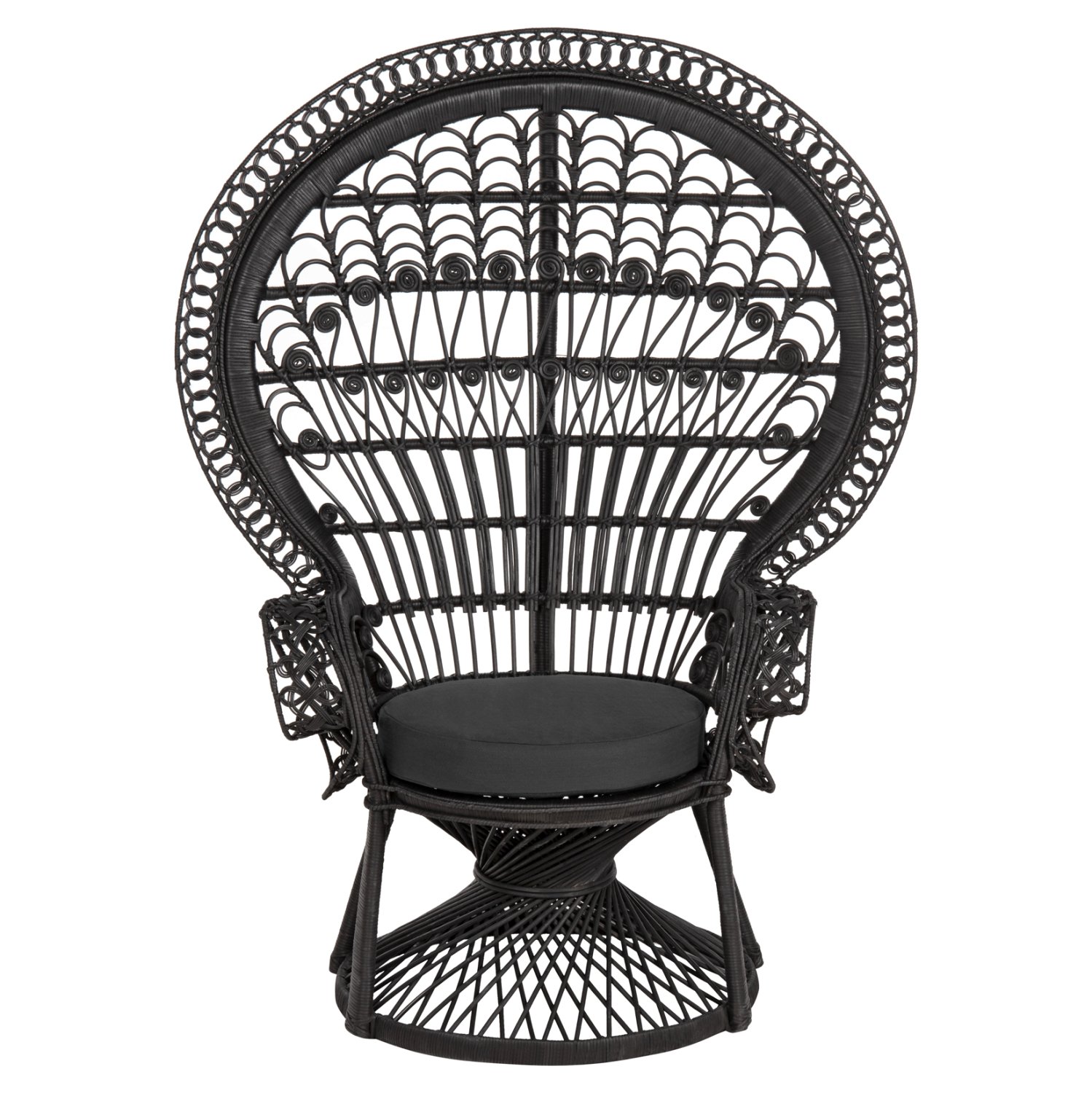 Η πολυθρόνα ROYAL PEACOCK από Rattan σε ΜΑΥΡΟ χρώμα είναι εντυπωσιακή και σίγουρα θα αφήσει το στίγμα της σε όποιο σαλόνι κι αν τοποθετηθεί. Το κάθισμά της είναι στρογγυλό και στηρίζεται σε μια εντυπωσιακή «πλεκτή» κυλινδρική βάση πάνω στην οποία υπάρχει το ΜΑΥΡΟ αναπαυτικό μαξιλάρι. Αλλά ακόμα πιο εντυπωσιακή είναι η κατασκευή των μπράτσων και της πλάτης. Το Rattan πλέκεται αριστοτεχνικά δημιουργώντας πανέμορφα σχέδια και οι διαστάσεις της πολυθρόνας τονίζουν ακόμα περισσότερο την τέχνη που υπάρχει στην κατασκευή της!