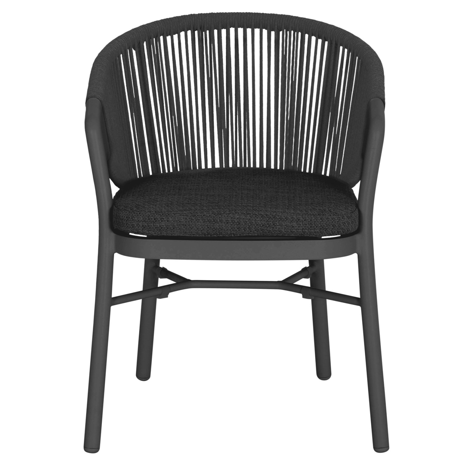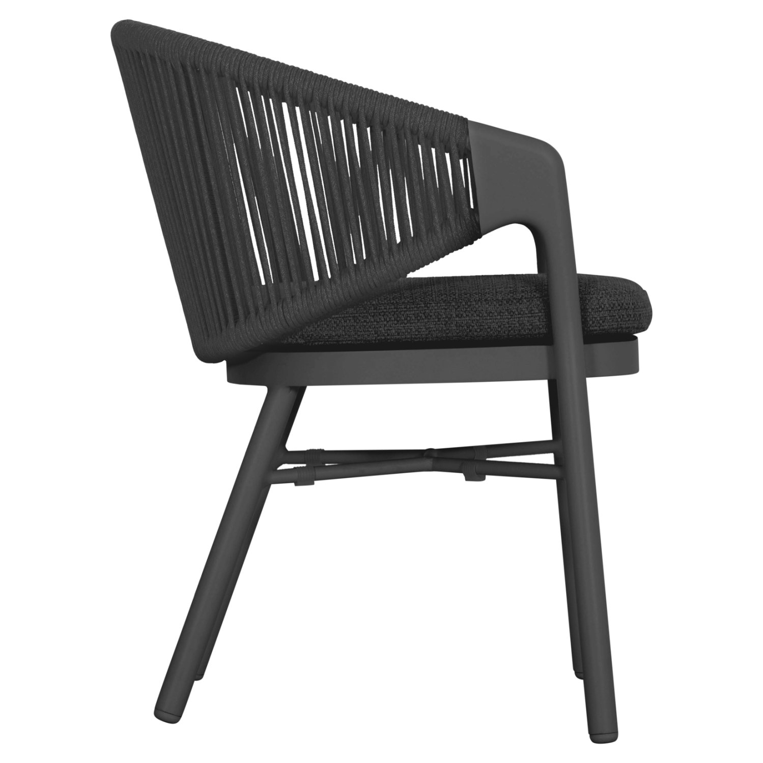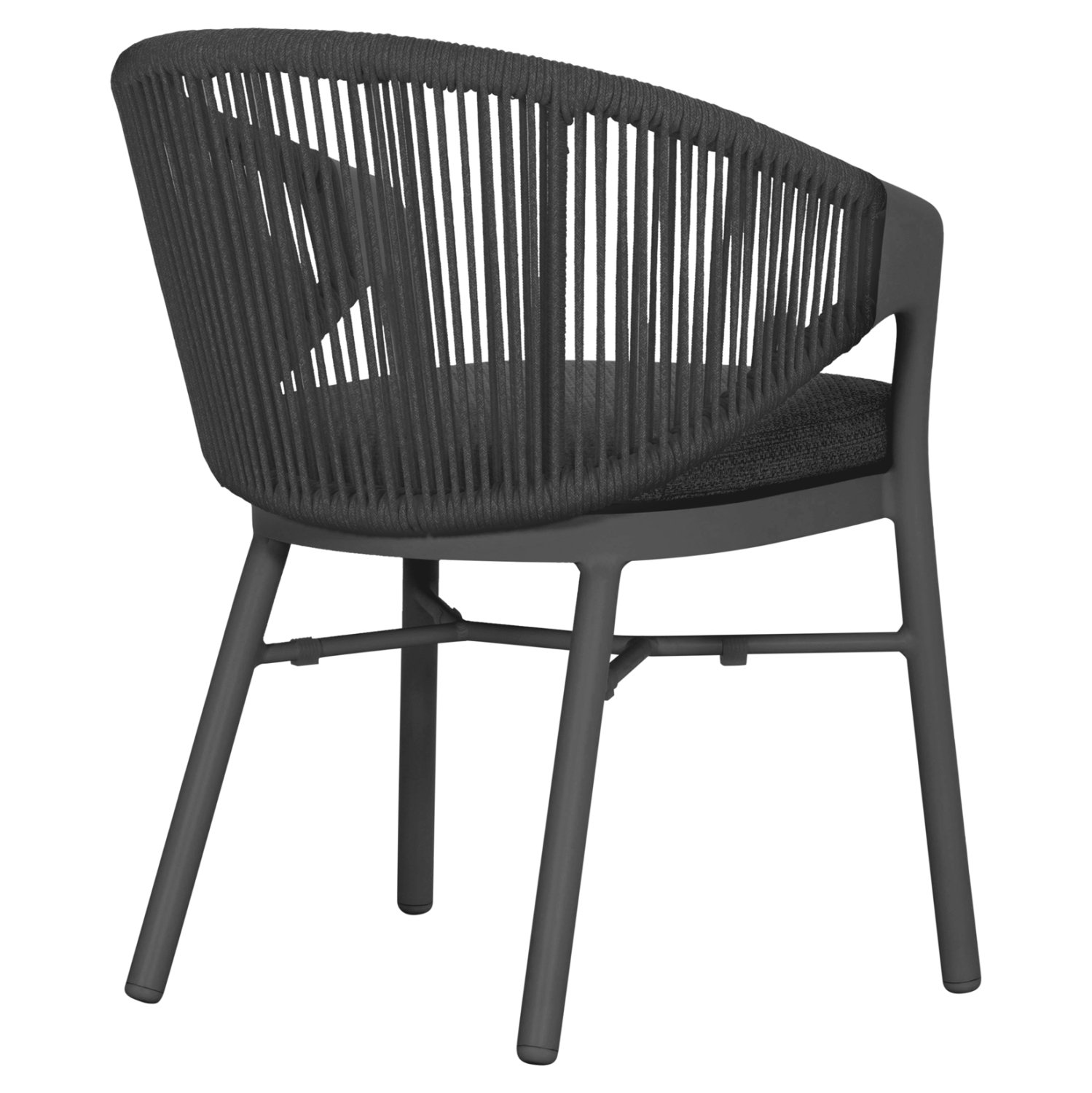 Η πολυθρόνα τραπεζαρίας εξωτερικού χώρου XANTION συνδυάζει άψογα την κομψότητα με τη λειτουργικότητα, αποτελώντας ιδανική επιλογή για βεράντες, αυλές και επαγγελματικούς χώρους φιλοξενίας. Διαθέτει ημικυκλική πλάτη με εντυπωσιακή πλέξη σχοινιού 6mm σε σκούρο γκρι χρώμα, που αγκαλιάζει το σώμα και προσφέρει αναπαυτική στήριξη. Ο σκελετός είναι από αλουμίνιο σε απόχρωση ΣΚΟΥΡΟ ΓΚΡΙ, προσδίδοντας μοντέρνο χαρακτήρα και υψηλή αντοχή στις εξωτερικές συνθήκες. Το μαξιλάρι καθίσματος διαθέτει αφαιρούμενο κάλυμμα από ύφασμα OLEFIN, εξαιρετικά ανθεκτικό στο νερό και στην ηλιακή ακτινοβολία.
