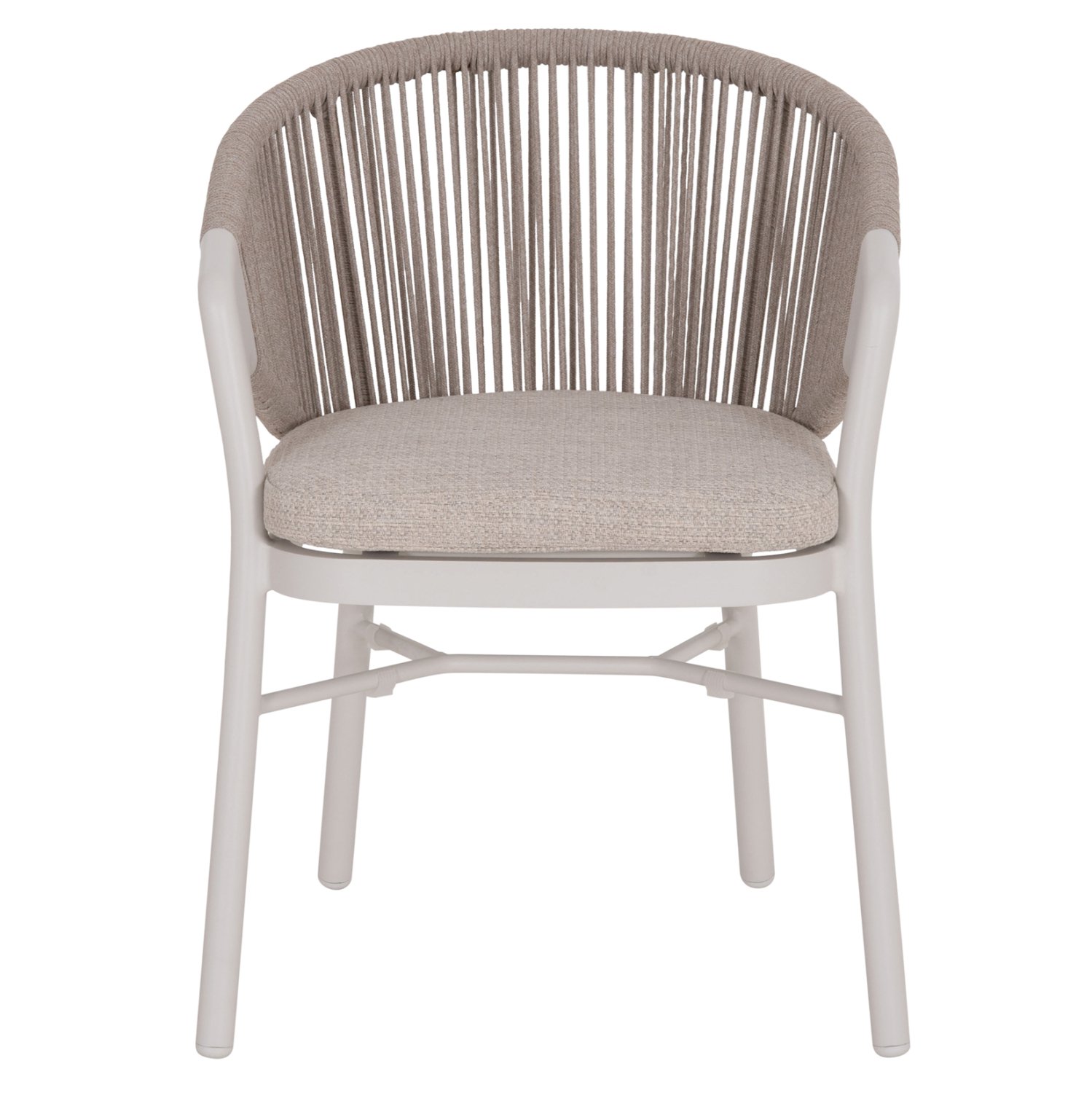 Η πολυθρόνα τραπεζαρίας εξωτερικού χώρου XANTION συνδυάζει άψογα την κομψότητα με τη λειτουργικότητα, αποτελώντας ιδανική επιλογή για βεράντες, αυλές και επαγγελματικούς χώρους φιλοξενίας. Διαθέτει ημικυκλική πλάτη με εντυπωσιακή πλέξη σχοινιού 6mm σε ΑΝΟΙΧΤΟ ΓΚΡΙ χρώμα, που αγκαλιάζει το σώμα και προσφέρει αναπαυτική στήριξη. Ο σκελετός είναι από αλουμίνιο σε ΛΕΥΚΗ απόχρωση, προσδίδοντας μοντέρνο χαρακτήρα και υψηλή αντοχή στις εξωτερικές συνθήκες. Το μαξιλάρι καθίσματος διαθέτει αφαιρούμενο κάλυμμα από ύφασμα OLEFIN σε ΑΝΟΙΧΤΟ ΓΚΡΙ, εξαιρετικά ανθεκτικό στο νερό και στην ηλιακή ακτινοβολία.