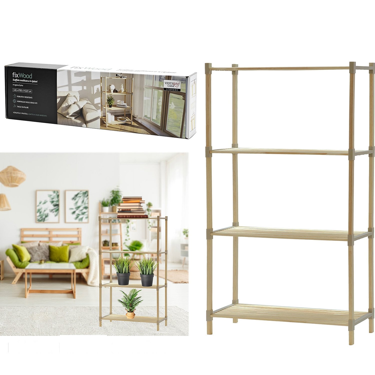 Το ράφι 4 επιπέδων είναι η ιδανική λύση για την οργάνωση και την αποθήκευση στον χώρο σας. Κατασκευασμένο από ανθεκτικό ξύλο, αυτό το ράφι προσφέρει στιβαρότητα και κομψότητα. Με διαστάσεις 66x32x117cm, διαθέτει τέσσερα επίπεδα που παρέχουν άφθονο χώρο για την τοποθέτηση βιβλίων, διακοσμητικών και άλλων αντικειμένων. Η φυσική του εμφάνιση ταιριάζει σε κάθε τύπο διακόσμησης, καθιστώντας το ιδανικό για το σαλόνι, το γραφείο ή το υπνοδωμάτιο. Εύκολο στη συναρμολόγηση, το ράφι Fixwood θα γίνει αναπόσπαστο μέρος του χώρου σας.