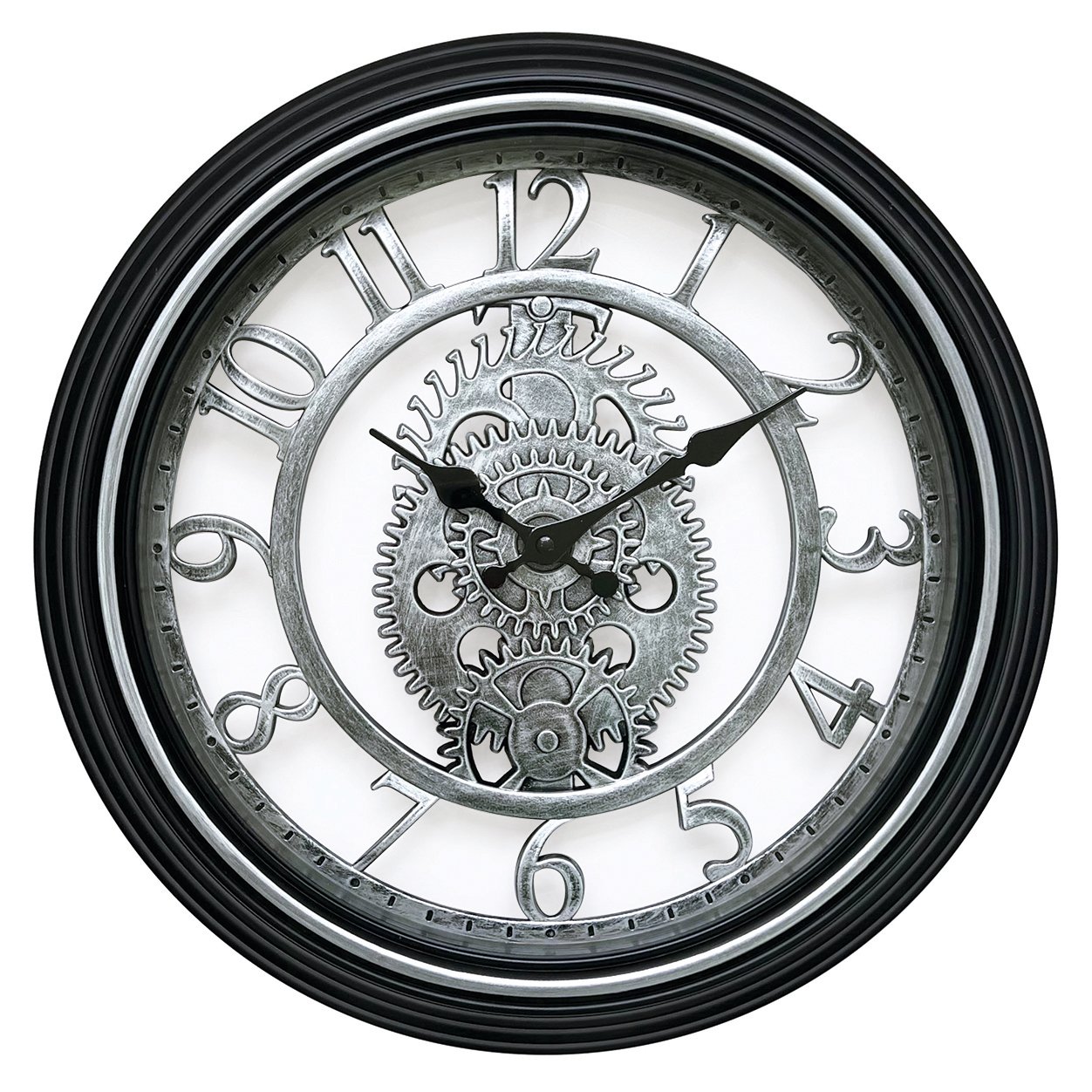 Ρολόι τοίχου στρογγυλό με γρανάζια στο κέντρο του σε ασημί και μαύρες αποχρώσεις.