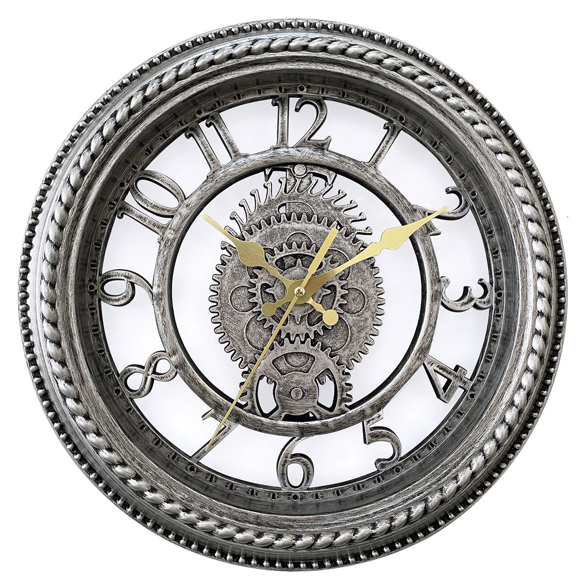 Ρολόι τοίχου στρογγυλό με γρανάζια στο κέντρο του σε ασημί αποχρώσεις.