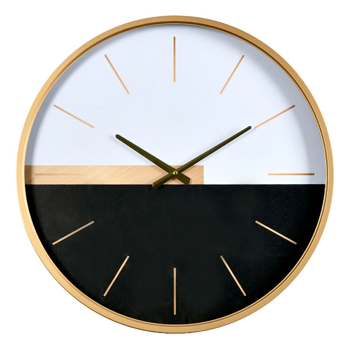 Ρολόι τοίχου στρογγυλό από μέταλλο με μαύρο και λευκό φόντο και χρυσή περίμετρο σε κλασικό σχέδιο.