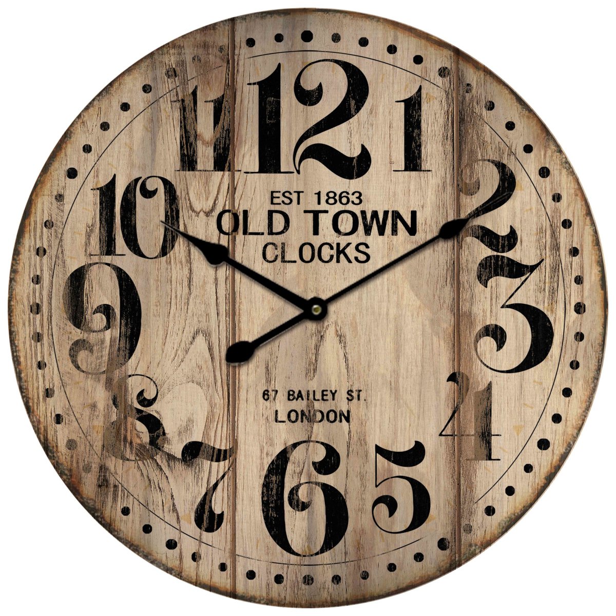 Ρολόι τοίχου στρογγυλό από MDF σε φυσική απόχρωση ξύλου και μεγάλα μαύρα νούμερα.