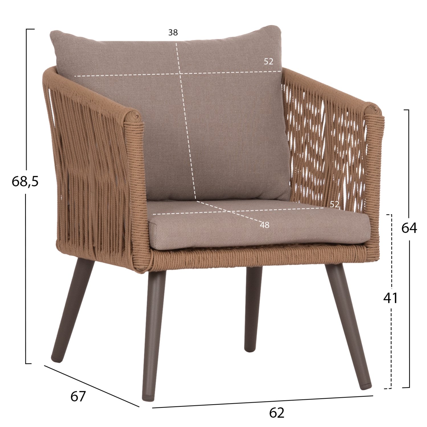Σας παρουσιάζουμε το όμορφο σετ σαλονιού εξωτερικού χώρου FREJA σε συνδυασμό χρωμάτων που θα λατρέψετε, με 1 τραπεζάκι, 2 πολυθρόνες και 1 διθέσιο καναπέ. Ο σκελετός σε όλο το σετ είναι από αλουμίνιο σε χρώμα ΚΑΠΟΥΤΣΙΝΟ, επενδυμένο με συνθετικό RATTAN σε ΜΠΕΖ χρώμα. Το design τους είναι πανέμορφο στην όψη ενώ η στιβαρότητά τους είναι εμφανής. Το τραπεζάκι είναι πρακτικότατο, ενώ οι πολυθρόνες είναι φαρδιές και αγκαλιάζουν το σώμα πράγμα που επιτείνει την άνεση που προσφέρουν, σε συνδυασμό με τα αναπαυτικά μαξιλάρια τόσο στο κάθισμα όσο και στην πλάτη. Ο διθέσιος καναπές σε παρόμοιο design είναι, όμως, το πιο εντυπωσιακό κομμάτι αυτού του σετ που τον καθιστά το σημείο αναφοράς. Τα μαξιλάρια σε όλο το σετ είναι επενδυμένα με πολυεστερικό ύφασμα σε ΜΠΕΖ χρώμα και διαθέτουν γέμισμα με μέτριας σκληρότητας αφρώδη υλικά για την μεγαλύτερη δυνατή άνεση, αλλά και φερμουάρ. Τι άλλο να ζητήσει κανείς για να αναβαθμίσει τον εξωτερικό χώρο της επιχείρησής του;