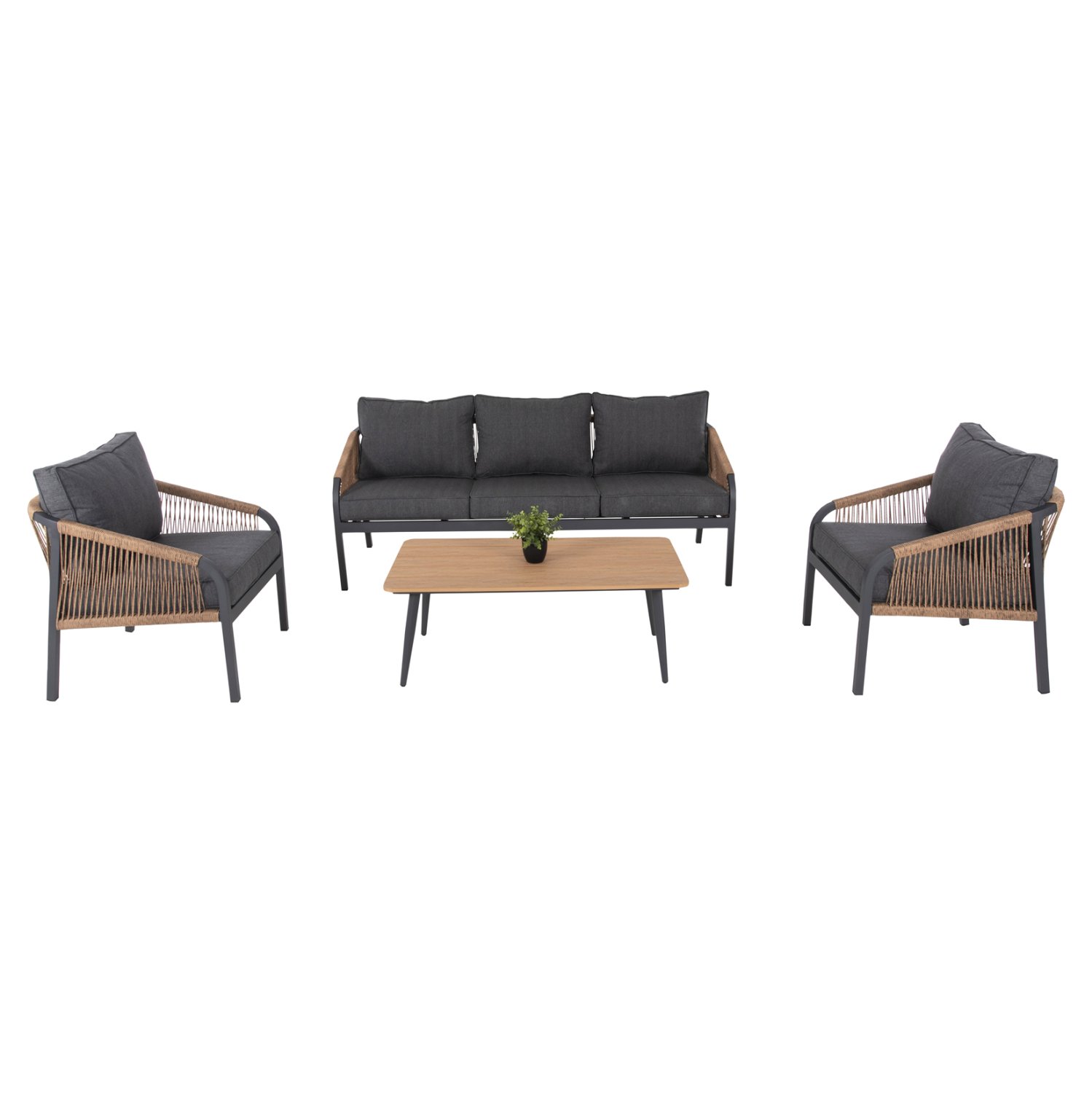 Σας παρουσιάζουμε το εντυπωσιακό και νέο σετ σαλονιού εξωτερικού χώρου MAERLY σε ΑΝΘΡΑΚΙ χρώμα, με τραπεζάκι, 2 πολυθρόνες και 1 τριθέσιο καναπέ. Ένα σετ που θα το λατρέψετε με την πρώτη ματιά. Ο σκελετός σε όλο το σετ είναι από αλουμίνιο επενδυμένο με ΜΠΕΖ συνθετικό σχοινί. Το design τους είναι πανέμορφο στην όψη ενώ η στιβαρότητά τους είναι εμφανής. Το κάθισμά στον καναπέ και τις πολυθρόνες είναι φαρδύ ενώ η πλάτη τους αγκαλιάζει το σώμα πράγμα που επιτείνει την άνεση που προσφέρουν, σε συνδυασμό με τα αναπαυτικά μαξιλάρια τόσο στο κάθισμα όσο και στην πλάτη. Ο τριθέσιος καναπές σε παρόμοιο design είναι, όμως, το πιο εντυπωσιακό κομμάτι αυτού του σετ με τις μεγάλες διαστάσεις του που τον καθιστούν το σημείο αναφοράς. Τα μαξιλάρια σε όλο το σετ είναι επενδυμένα με πολυεστερικό ύφασμα σε ΑΝΘΡΑΚΙ χρώμα και διαθέτουν γέμισμα με μέτριας σκληρότητας αφρώδη υλικά για την μεγαλύτερη δυνατή άνεση, αλλά και φερμουάρ. Τι άλλο να ζητήσει κανείς για να αναβαθμίσει τον εξωτερικό χώρο της επιχείρησής του;