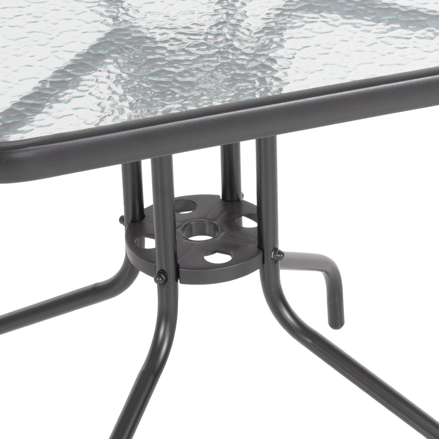 Ένα τραπέζι κατασκευασμένο από μεταλλικό σκελετό σε γκρι απόχρωση με γυάλινη επιφάνεια.