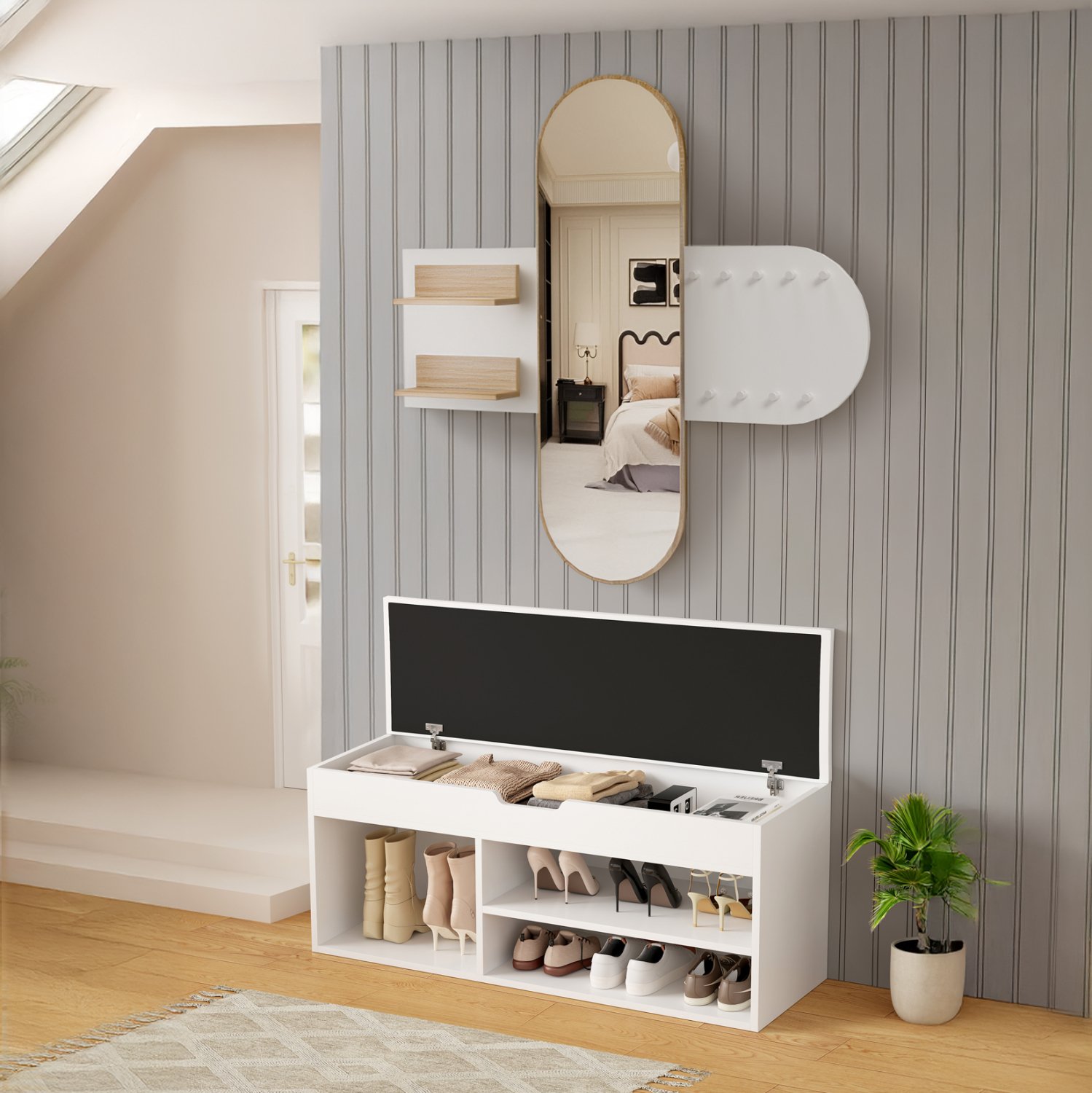 •Μία παπουτσοθήκη σε ΛΕΥΚΟ χρώμα με κάθισμα επενδυμένο με PU δέρμα. Ο χώρος αποθήκευσης είναι ανοιχτός με 2 επίπεδα στην μια πλευρά και έναν μεγαλύτερο στην άλλη για ψηλότερα παπούτσια, ενώ κάτω από το κάθισμα που ανασηκώνεται υπάρχει ακόμα ένας, πιο ρηχός, χώρος αποθήκευσης αντικειμένων.