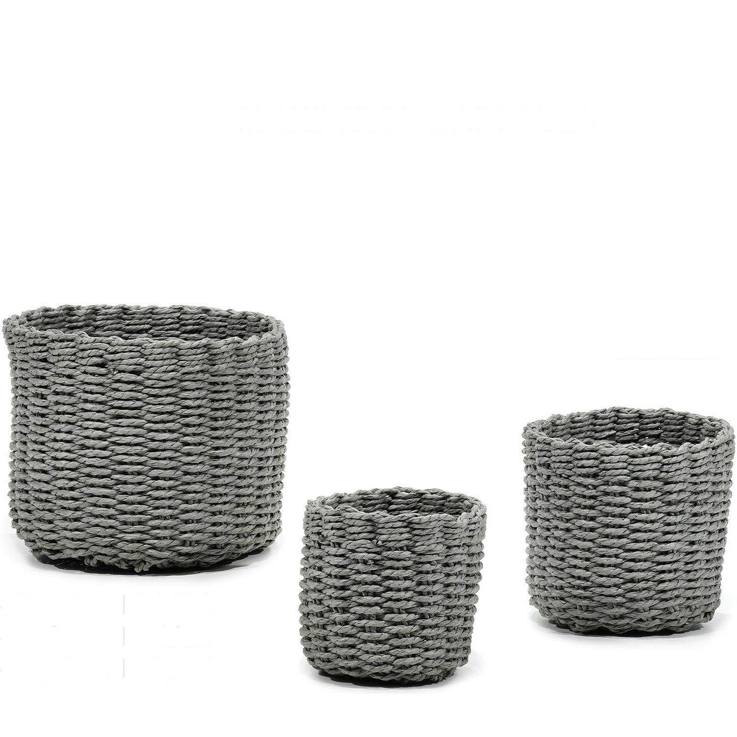 Σετ από τρία στρογγυλά καλάθια σε γκρι χρώμα, κατασκευασμένα από χαρτόσχοινο, ιδανικά για αποθήκευση και διακόσμηση. Περιλαμβάνονται καλάθια με διαστάσεις 17.5cm, 15cm και 12.5cm.