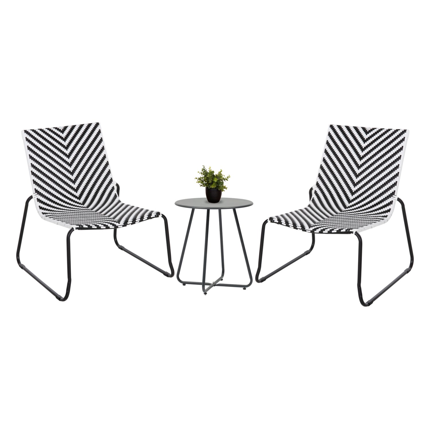 Το PONY είναι ένα lounge σετ (σαλονάκι) 3τμχ εξωτερικού χώρου, που αποτελείται από 2 ΜΑΥΡΕΣ μεταλλικές καρέκλες με πλέξη (wicker) από συνθετικό Rattan σε ασπρόμαυρο χρώμα, κι ένα στρογγυλό ΓΚΡΙ μεταλλικό τραπεζάκι.