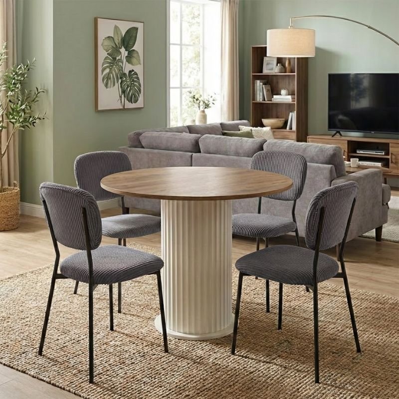 Η τραπεζαρία Bohema – Kevin θα φέρει μία αίσθηση εκλεπτυσμένης κομψότητας στον χώρο σας. Το πλούσιο κοτλέ ύφασμα της καρέκλας χαρίζει ζεστασιά και υφή, ενώ τα μεταλλικά πόδια προσδίδουν μοντέρνο χαρακτήρα και σταθερότητα. Ιδανική επιλογή τόσο για το σπίτι όσο και για επαγγελματικούς χώρους που θέλουν να επικοινωνήσουν ποιότητα και design σε κάθε λεπτομέρεια.